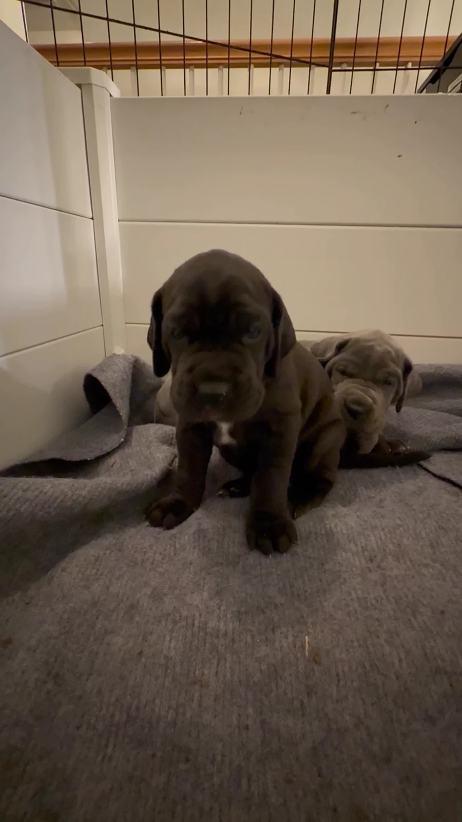 Millie is 100% European Great Dane, with a velvet-soft black coat and a splash of white on her chest. She’s calm, affectionate, and has the classic big blocky head that turns heads everywhere she goes. As a dam, she’s nurturing and gentle, with a sweet nature that shines through in every pup she raises. She also has a serious love for water—we joke that she has a drinking problem. Her preferred vessel? A 5-gallon bucket, which she drinks from with gusto, often dunking her whole head in like she’s bobbing for apples.