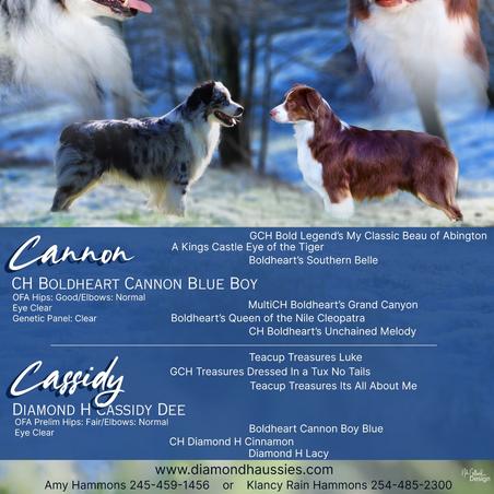 Diamond H Aussies reports to performing the health tests below on their breeding dogs. Ask your breeder about the tests performed on the parents of your litter. Learn more about health testing for Australian Shepherds.