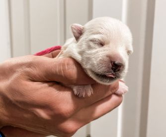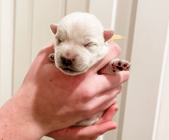 Roxie is full of personality. She loves to go on long walks in the field and protect the house from all the yard critters. She is sweet with children and SUPER playful. She usually hits her playfulness peak at about 10pm at night 😂. She is well trained and knows lots of cute tricks! Shes been an incredible mom with strong instincts. She usually hits our third generation “diamond in the ruff” Westie mom and is making us proud!
