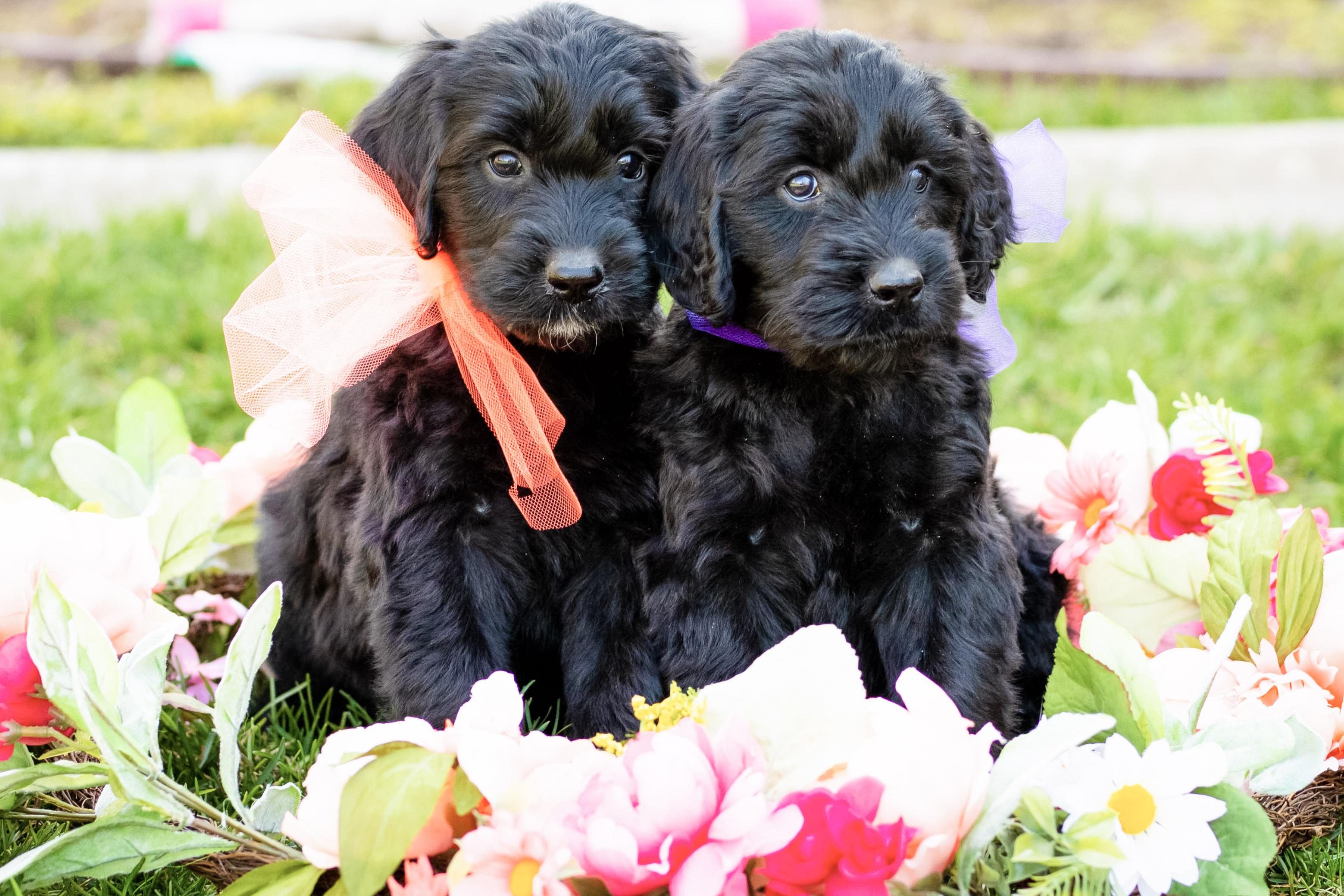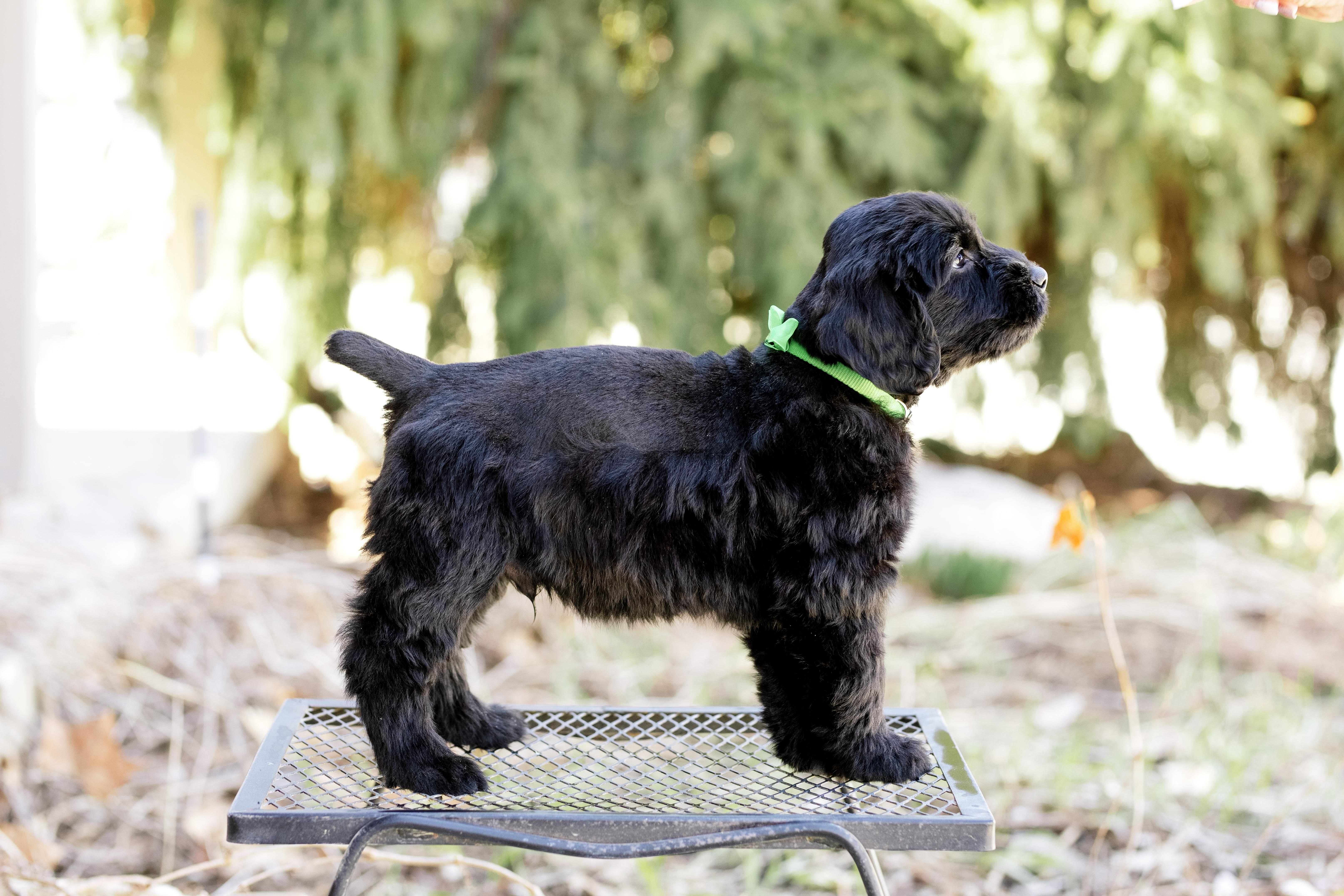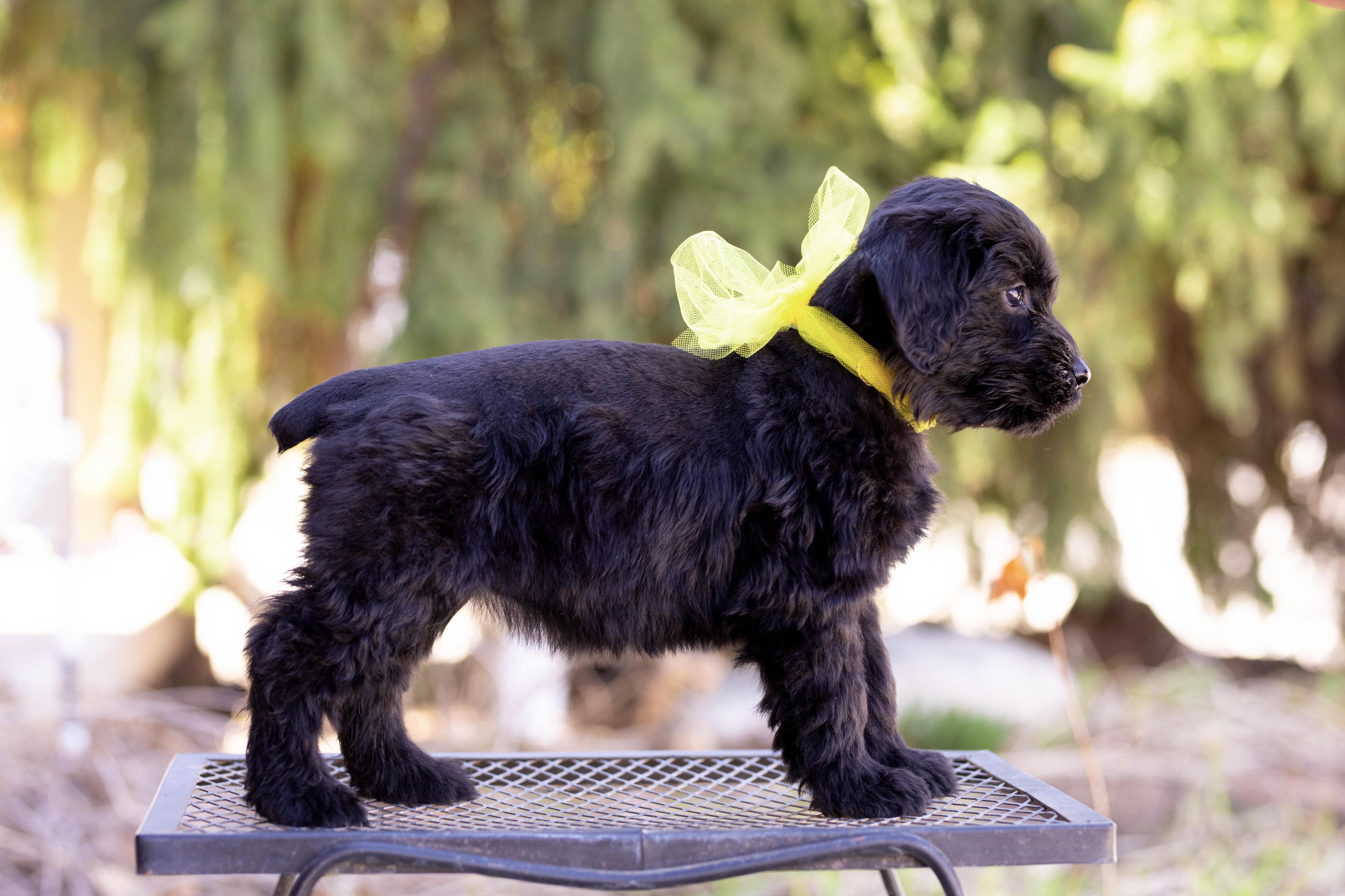 Our West Highland White Terrier puppies are white. Giant Schnauzer puppies include pepper and salt and black. Colors will vary depending on the parent dogs.