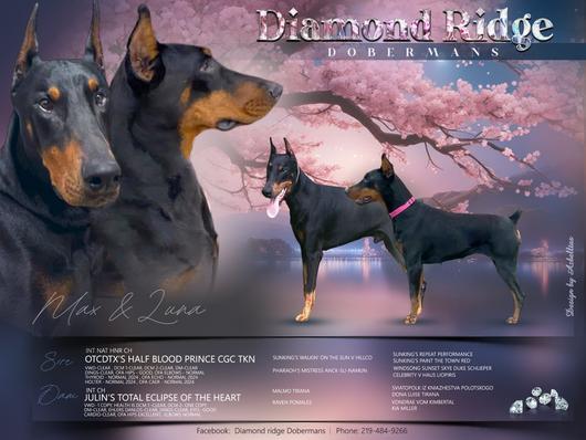 I'm JULIE D., the breeder behind DIAMOND RIDGE DOBERMANS located in Winamac, IN. Our puppies are raised in our home. We put a lot of care into socializing and caring for our top-quality Doberman Pinscher puppies. Our goal is to produce healthy dogs with amazing temperaments while leaving a legacy of greatness in the breed. We are dedicated advocates for proper breeding techniques.