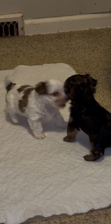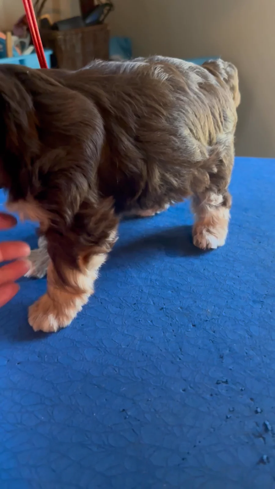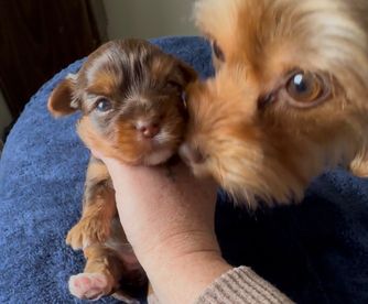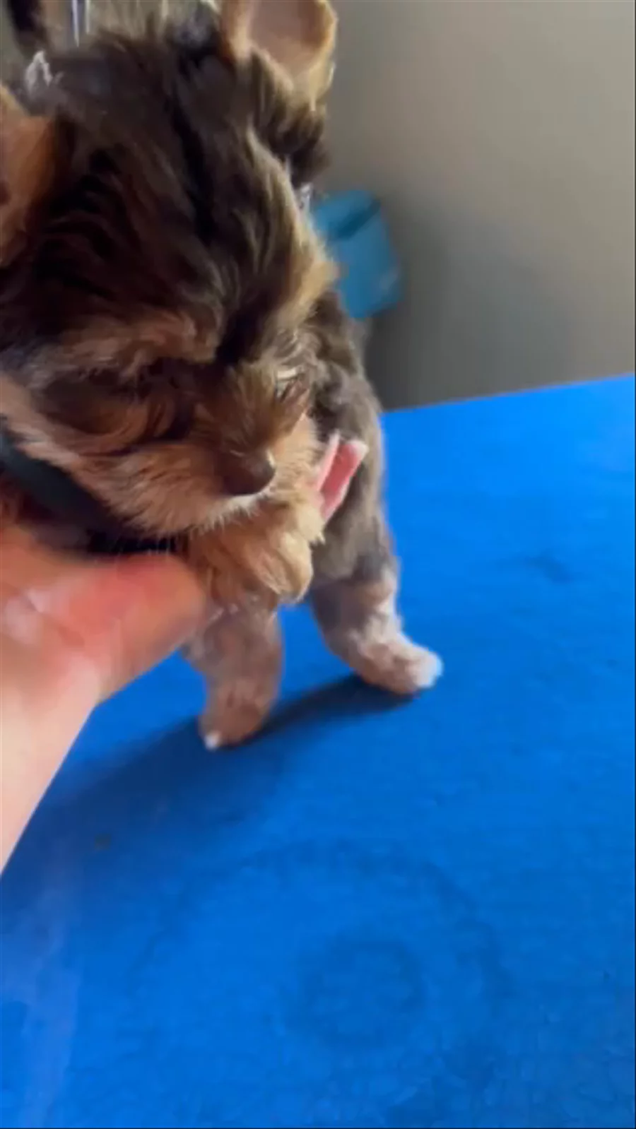 Almost 8wks old. Just had their first distemper shot. They did so good!! Everyone at the vet adored them! Only a few weeks before they can go to their fur ever home. Only one available A Male Chocolate & Tan Parti Yorkie. This guy is so loving & playful he will make a wonderfully loyal & loving companion!
