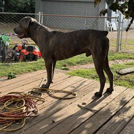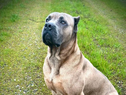 Imagine a 125lb Formentino Mastiff stud with a broad, muscular frame that strikes a perfect balance between power and agility. His coat is a soft fawn color with a subtle silver hue, his expression gentle yet confident. Despite his imposing size, his temperament is both loving and protective, making him an ideal family dog. He's great with toddlers, playing joyfully and keeping a watchful eye, always aware of their movements and needs. His playful side is perfectly complemented by his instinctual protective nature—when strangers approach, he shifts to an alert, watchful stance, ready to defend his family without hesitation. His strong, athletic build allows him to move quickly and with surprising agility, showcasing his perfect stature for both companionship and protection.