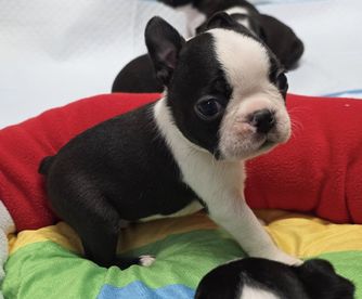 Our Boston Terrier puppies include black brindle and white, brindle and white, and black and white. Shiba Inu puppies are red. Colors will vary depending on the parent dogs.