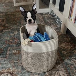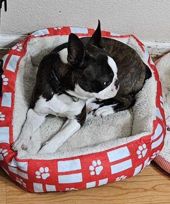 Hank is settling in nicely. Our vet was very pleased with him. He is a happy little guy, loves all toys and is working on winning over his big brother. Shannon was amazing throughout the whole process. I’d been following DITR for almost two years. A lot of the Boston breeders in our area breed the designer colors instead of to standard. Still, committing to a dog in another state who we’ve never met was a new experience for us. We finally decided the time was right and I reached out to Shannon. Everything just seemed to fall into place. Any questions or concerns were answered quickly. Even though we had 2nd pick of the boys, we ended up with our 1st choice! We got updates on milestones, vet visits and health testing on the parent dogs. It was finally time to fly to Denver and bring Hank Williams home to Texas. Another new experience! Shannon let me know exactly where to meet her dad. He arrived with our puppy in an airline carrier, all the paperwork and a tote bag full of supplies and toys. BIG thank you to Diamonds in the Ruff and Shannon for our perfect new addition.