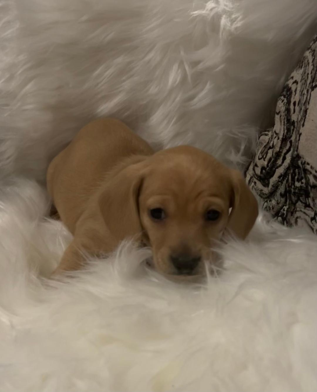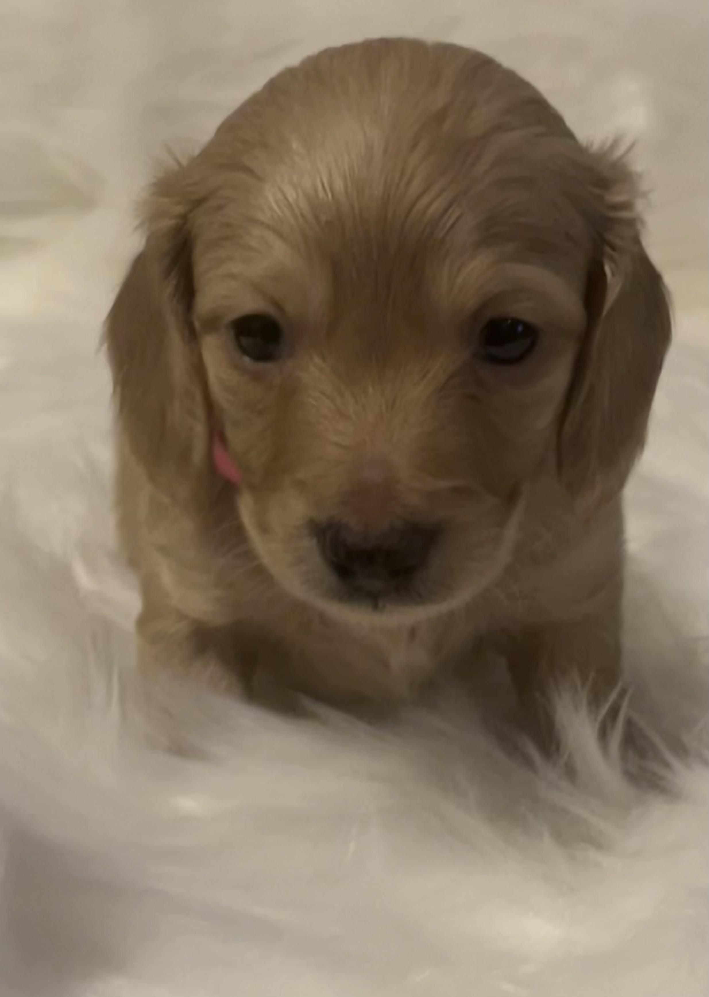 Lady Ardella has the most beautiful eyes, and will melt your heart! She is a gorgeous cream colored AKC mini dachshund that weighs 14lbs. She is great with children!! She loves to be on the run with you, or just snuggle up under a blanket. She loves to EAT so watch your food around her haha She really has the softest fur and best snuggles you will ever get!! She is a red sable AKC that carries for cream, red sable and piebald. She has long hair on her ears that is black and makes her have an ombre look. Not seen too well in photo.