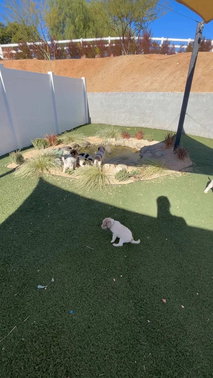 Tovah and Higgin’s Litter is getting bigger. Playtime is fun to watch. They play and then wear each other out. They explored our backyard puppy park and pond.