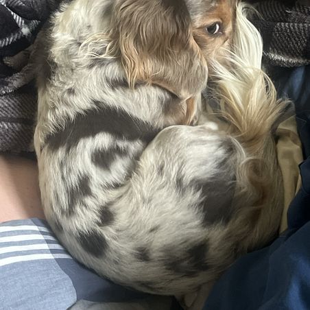 Stacy Tater is out of our MoMo (AKC Moe Fuzzy) and carries on his dilute line. She is a silver dapple with piebald, roan, and carries dilute from our phenotypic CDA clear line! She has his wonderful, family-oriented, loving, and snuggly personality. She is 10.5lbs. She is CKC registered and DNA tested.