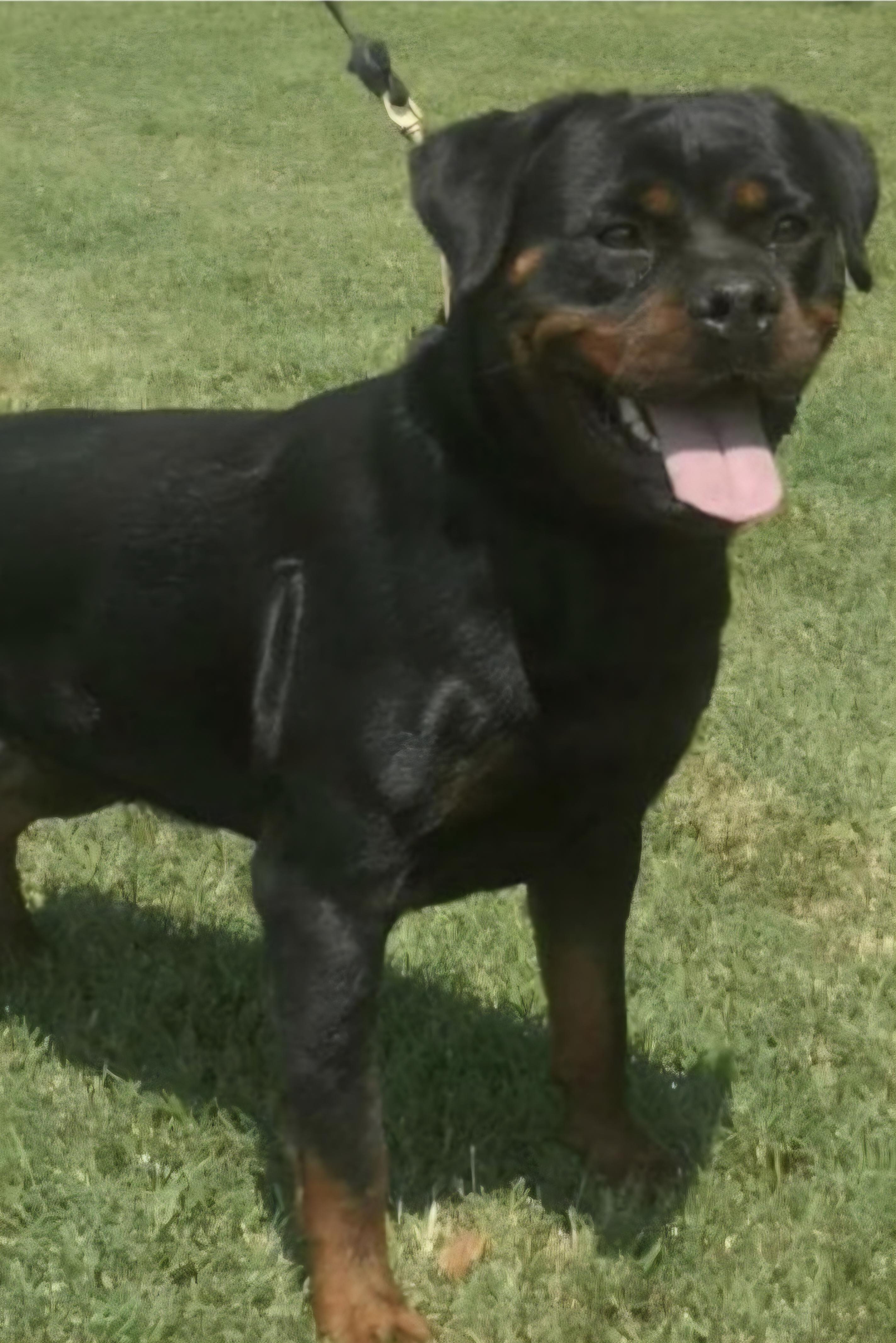 Bia is the sweetest prettiest female!!! She has a beautiful block head, dark mahogany markings, perfect confirmation, she is stocky with large bone structure, and the absolute best temperament you can find in a rottie. She has a pedigree packed full of champions and is health cleared.