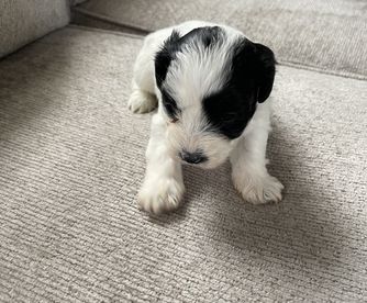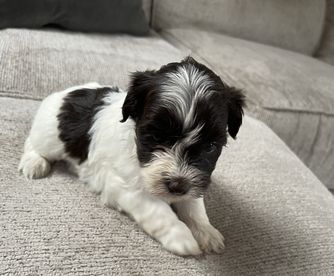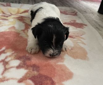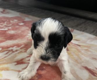 Our Miniature Schnauzer puppies include parti, liver, and black. Schnoodle puppies include black, brown, parti, and black and white. Colors will vary depending on the parent dogs.