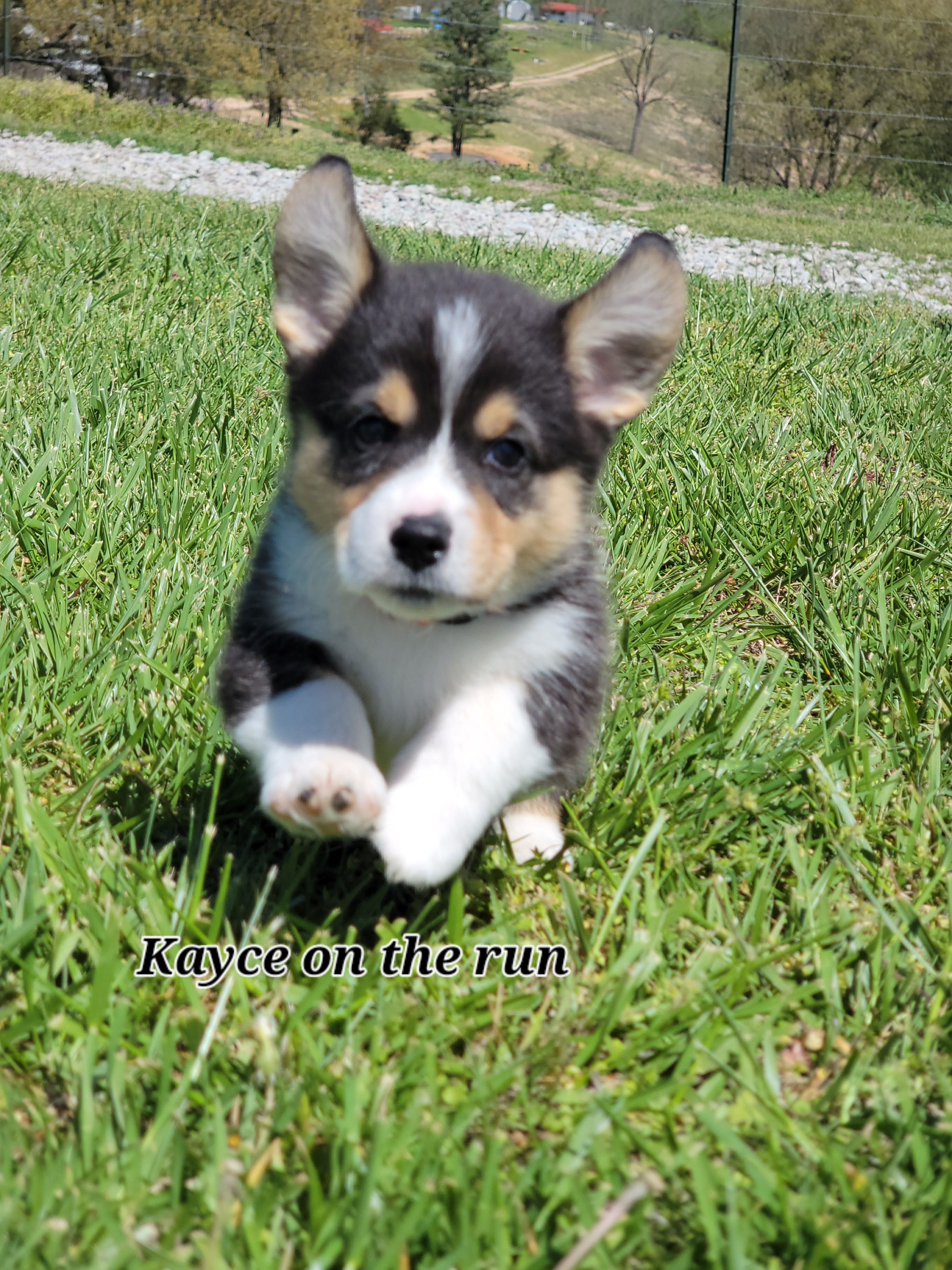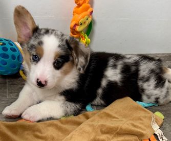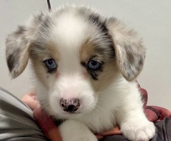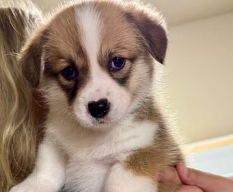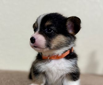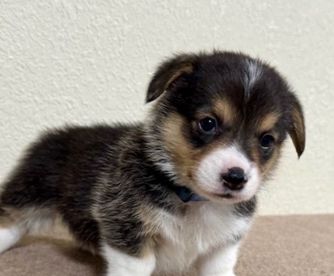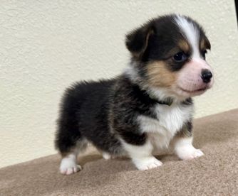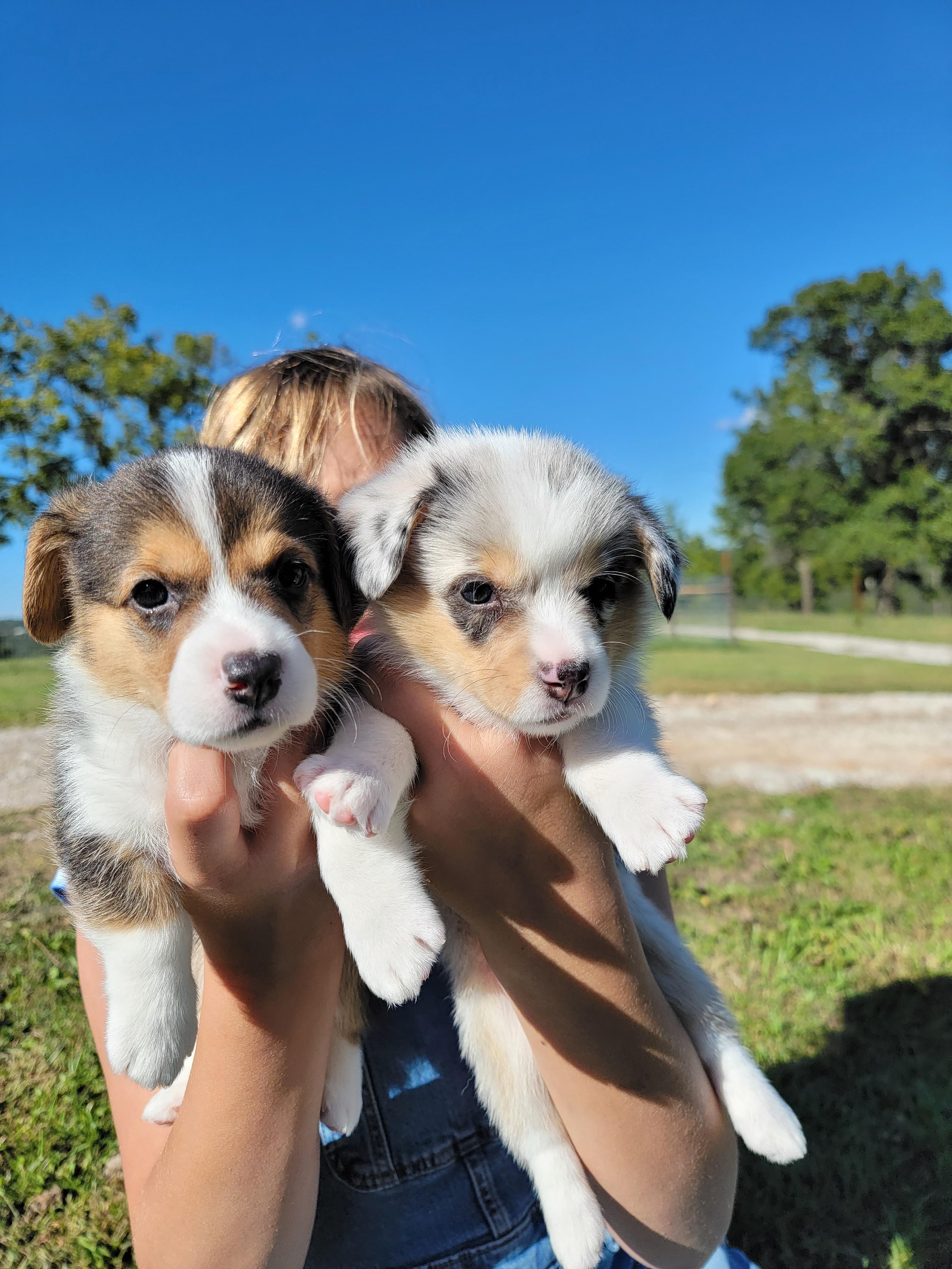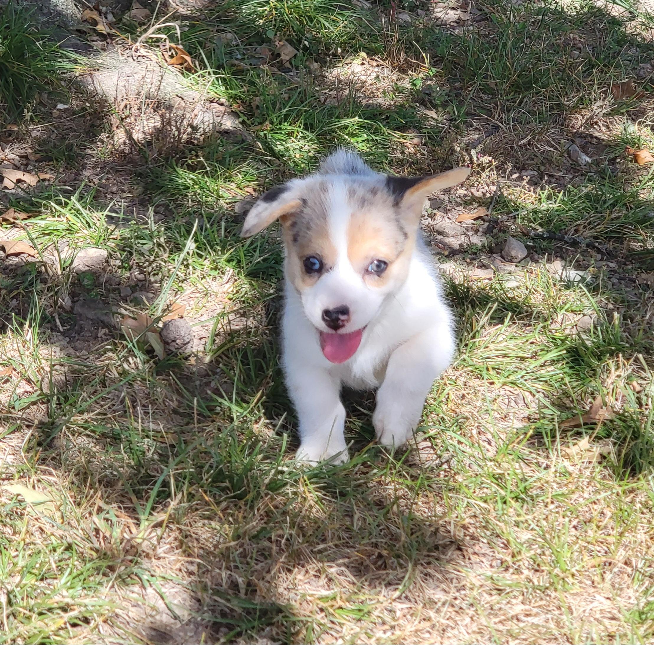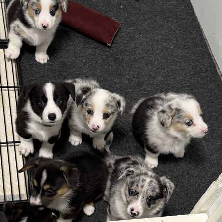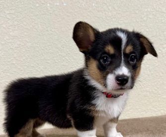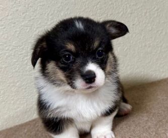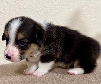 Our Cardigan Welsh Corgi puppies include black and white and blue merle and white. Pembroke Welsh Corgi puppies include white and red and black and tan. American Corgi puppies include black and tan, blue merle and white, and black and white. Colors will vary depending on the parent dogs.