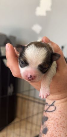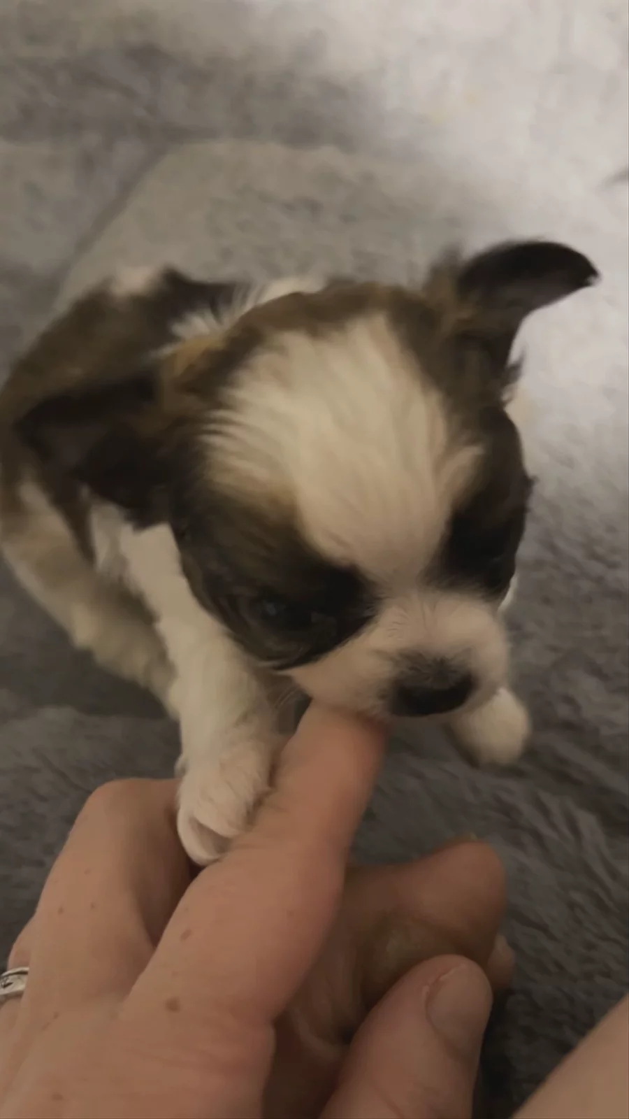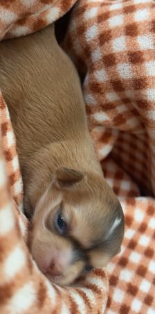 Kevin is my trouble making, fetching, happy go lucky boy that does have a timid side to him when you first meet him. LOVES kisses and cuddling your head at night. Weighs 4.5 lbs, long coat red sable spot on white with champions in the bloodlines. Born 10/8/24 ❤️
