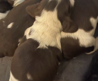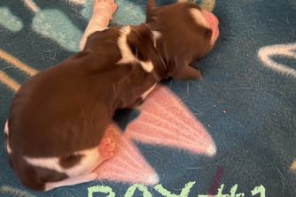 Our puppies include liver white and tan and liver and white. Colors will vary depending on the parent dogs.