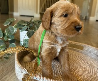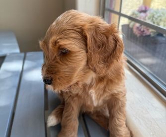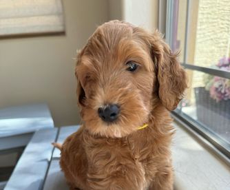 Lulu is a beautiful Multi-gen Standard Golden Doodle. She is a cream color with tan accents, wavy coat, and has a gentle temperament. She is calm and submissive and loves attention.