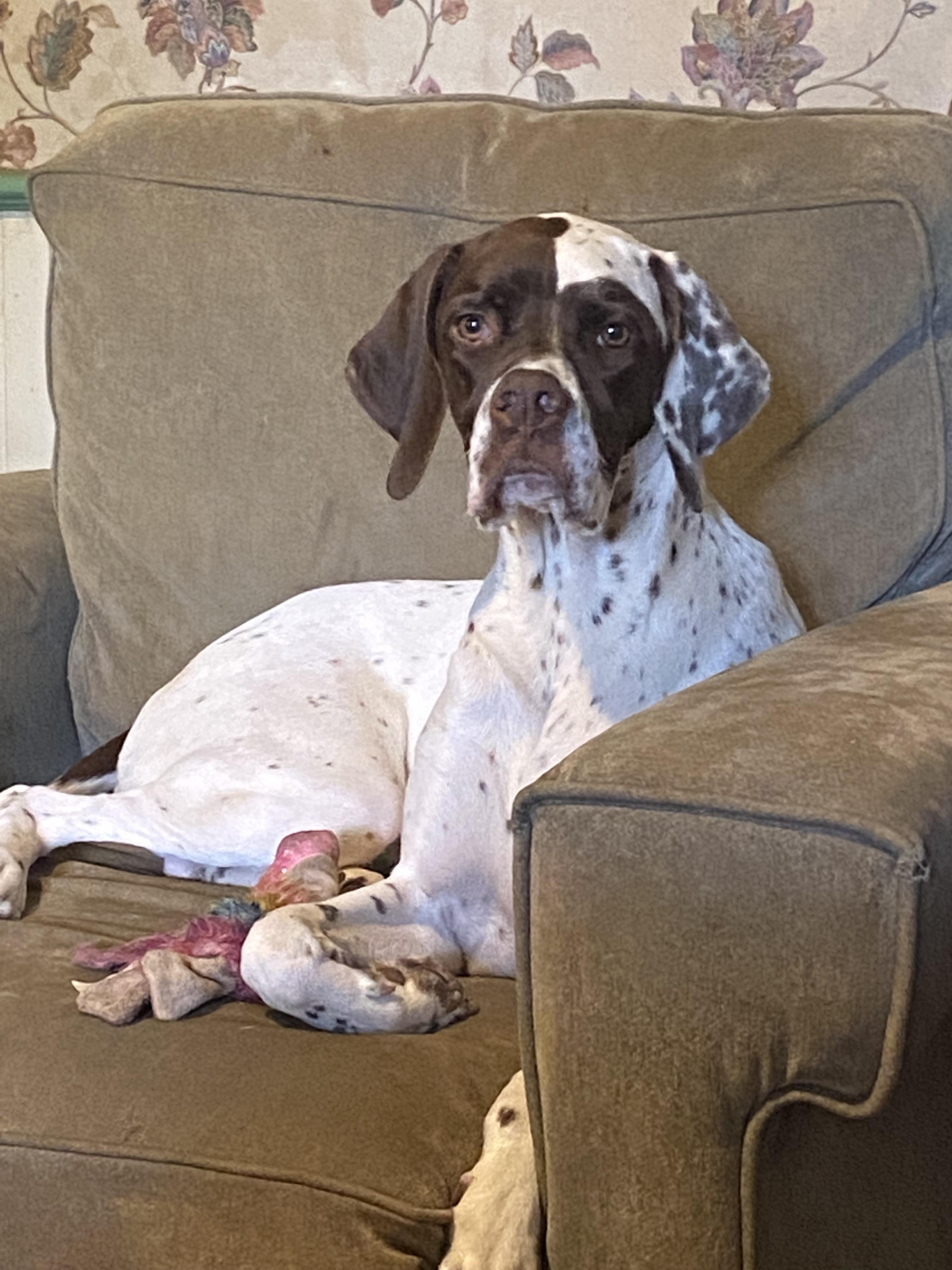 Moon Pie is the silliest, happiest, and sweetest dog at Dogma. Moon Pie oozes Pointer breed type and is the epitome of the temperament that the standard calls for, something that has been lacking as of late in some other breeder’s programs. Confident, friendly, and cheerful, she is birdy and incredibly intelligent. Have you ever seen a Pointer “smile”? Moon Pie does! Moon Pie has had one litter prior of incredible offspring, with one son finishing his AKC championship at 7 months old (and another who already just needs a few singles to finish, at not even a year old)! She is the best mother we have ever had, who loves her babies like no other- and will let them nurse for forever to be able to have the snuggle time with them. LOL