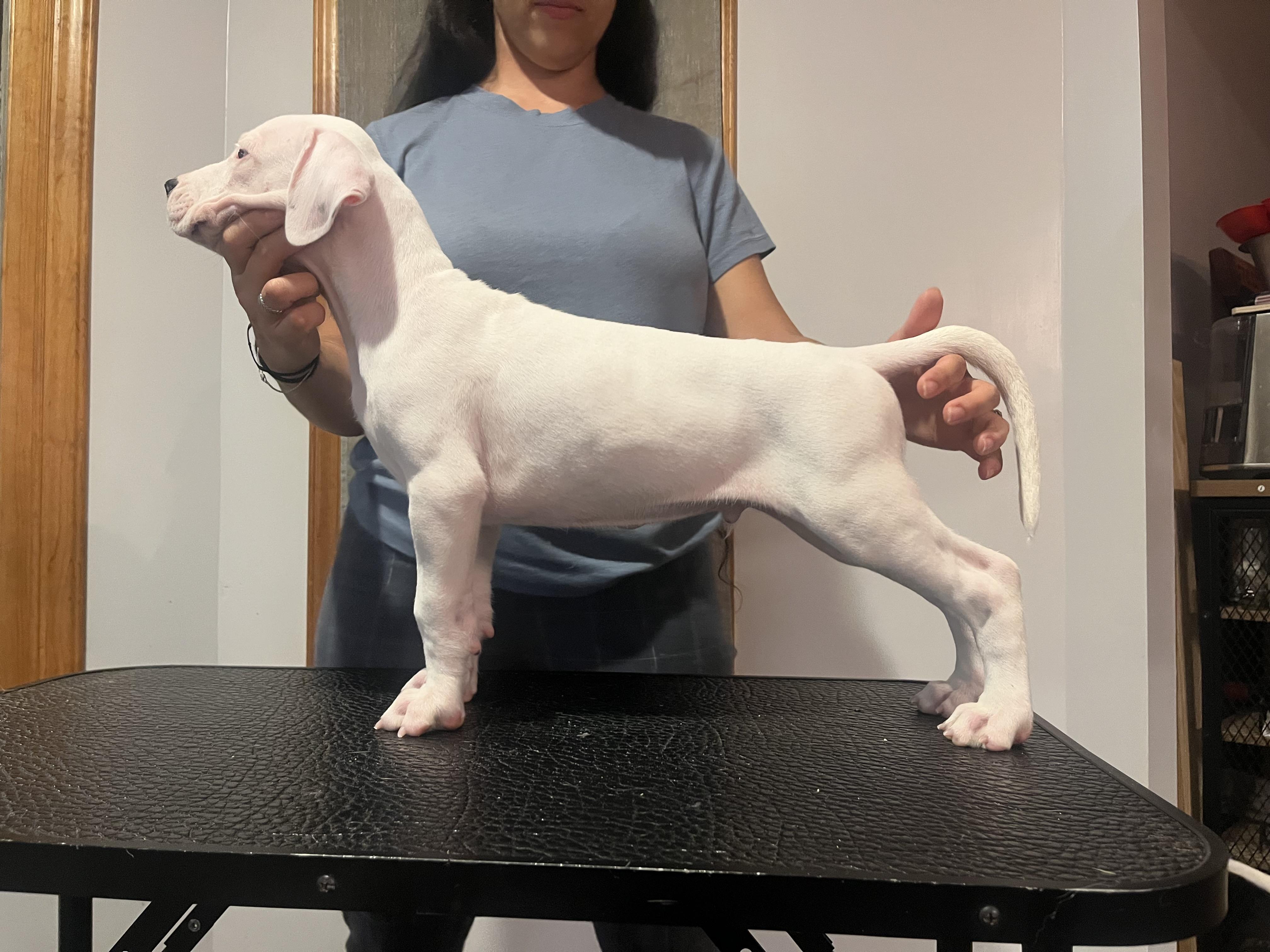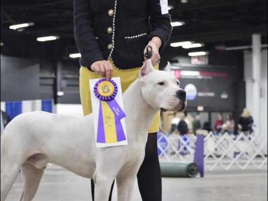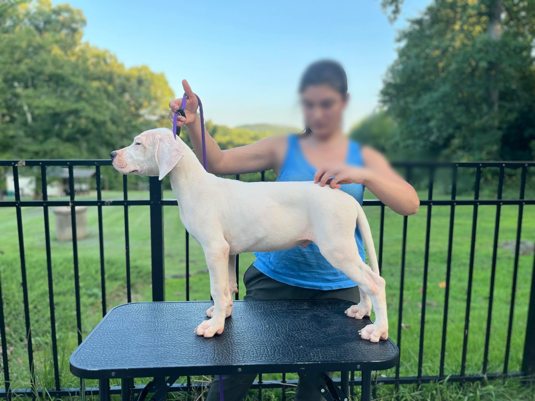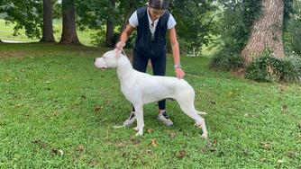 Moncho is a loving Dogo who loves his people and is the best with puppies. He was imported from Argentina last year from world renowned kennel, Bravoure Blanche. He has started his show career successfully with multiple best of breed wins. He loves competing in other sports as well such a fast cat, CAT, barn hunt, and obedience. His owner is a full time dog trainer who he loves to go to work with.