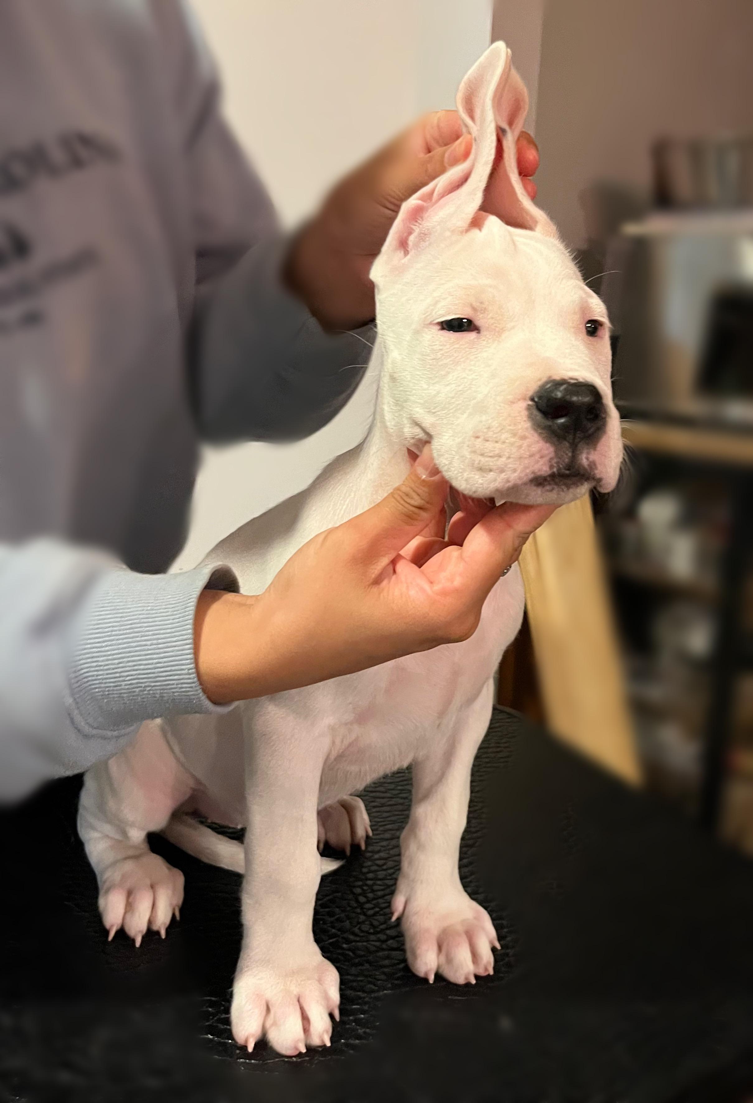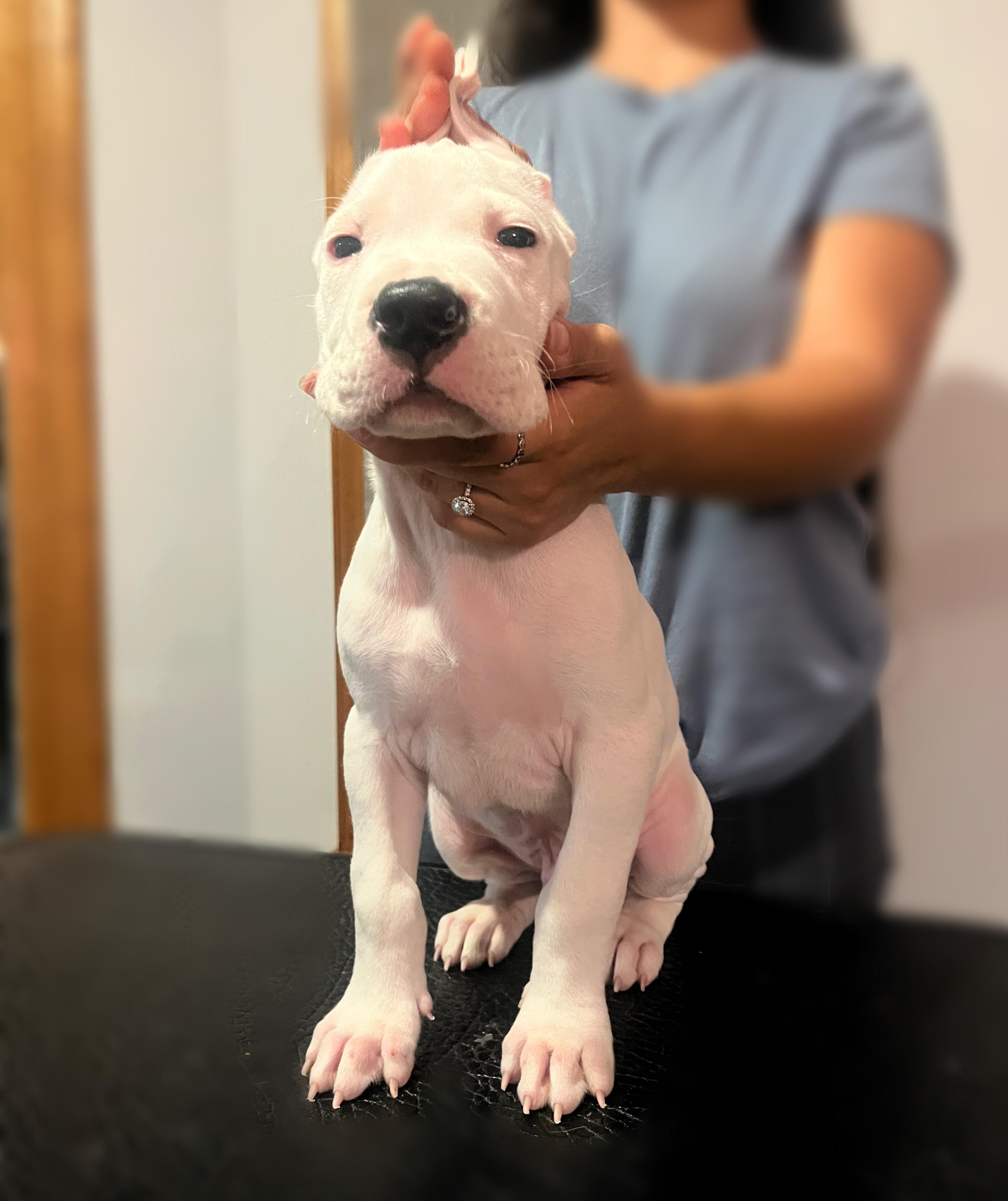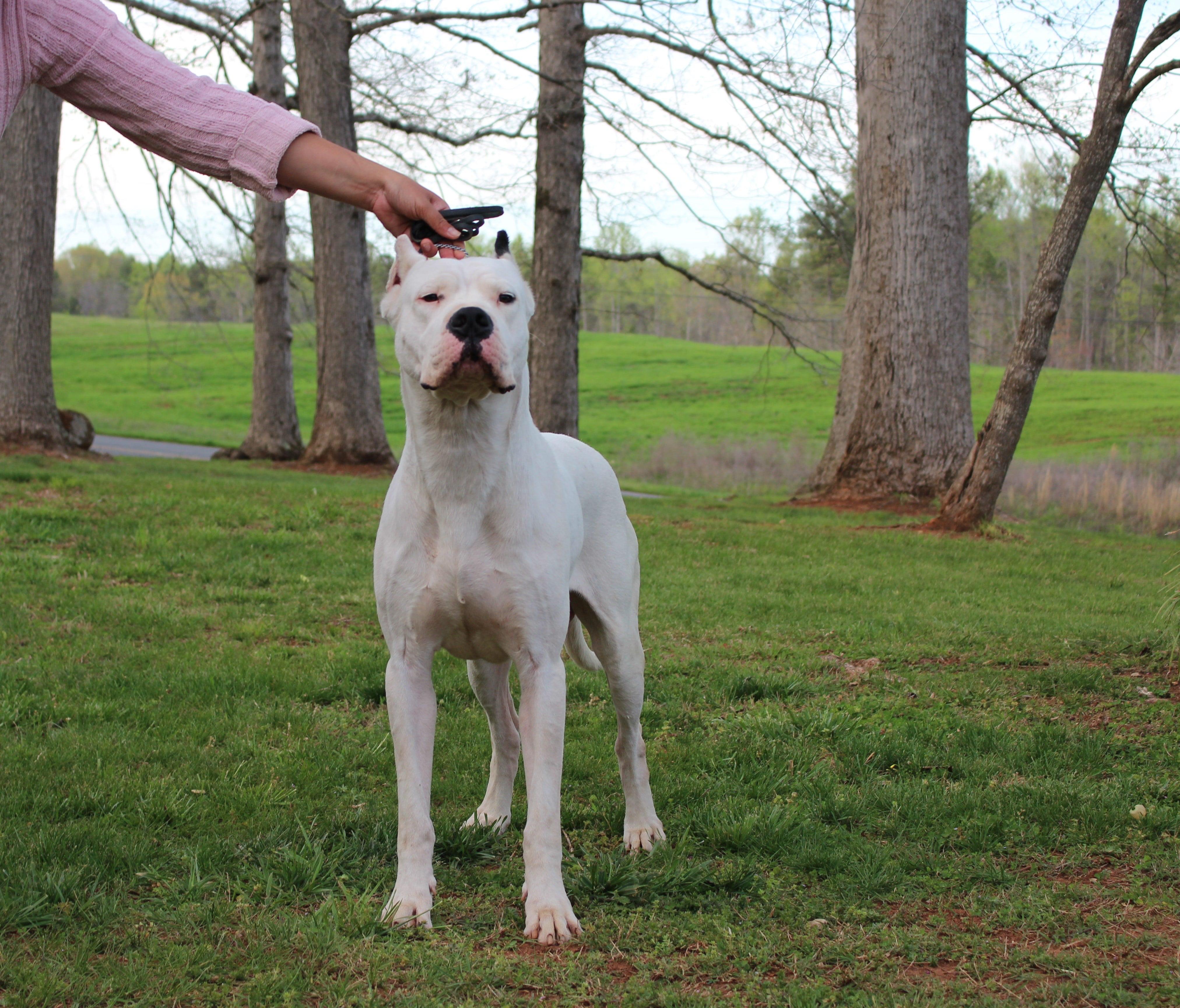Moncho is a loving Dogo who loves his people and is the best with puppies. He was imported from Argentina last year from world renowned kennel, Bravoure Blanche. He has started his show career successfully with multiple best of breed wins. He loves competing in other sports as well such a fast cat, CAT, barn hunt, and obedience. His owner is a full time dog trainer who he loves to go to work with.