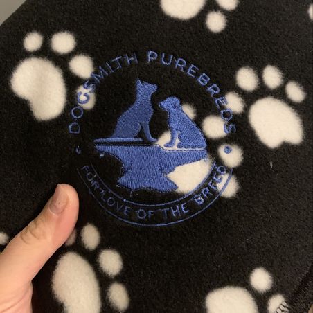 Dixie’s babies are going home tomorrow! It’s amazing how fast time flies. These two have been so delightful to have around, in our home and hearts. We’re so excited for their new families! Check out this beautiful personalization on the puppy blankets. 🤩
