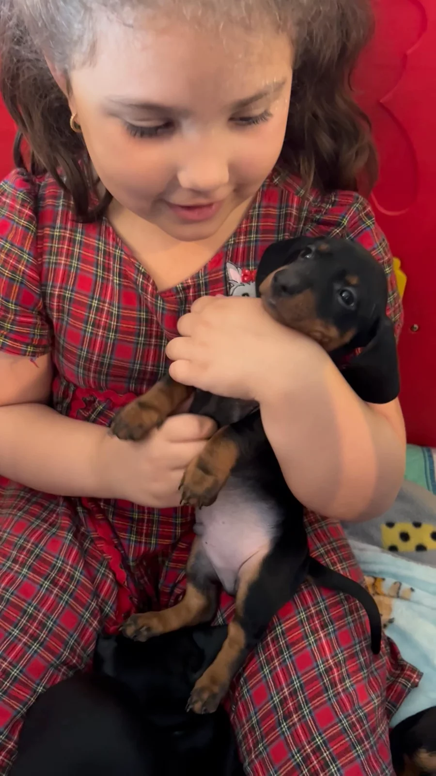 Not long after, Helena arranged a FaceTime call so we could meet the puppies. None had been reserved yet, and each one had a temporary name and a color-coded collar to help families tell them apart in photos. She introduced us to each of the males one by one. When she got to a little guy named “Lucky,” wearing a red collar, she said, “He’s a snuggler.” As if on cue, he climbed up, curled around her neck, and fell asleep. That was the moment we knew—he was our pup. We reserved him that same day.