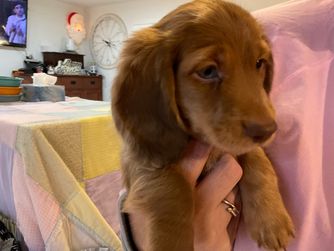 “All of our puppies are AKC Registered Miniature Dachshunds with 1 Year Health Guarantee, first shots minimum, dewormed, socialization and potty training started!”