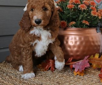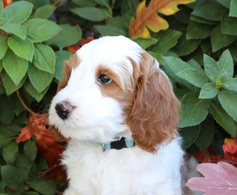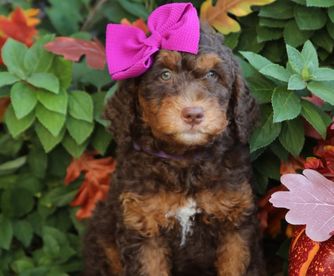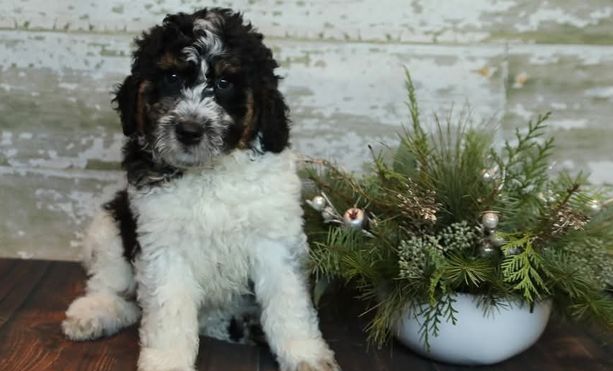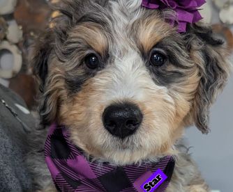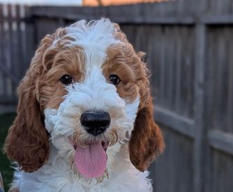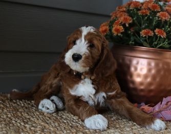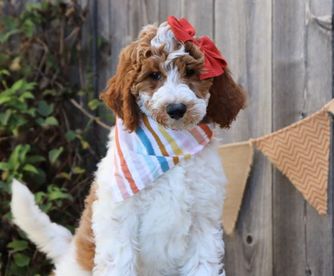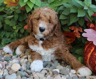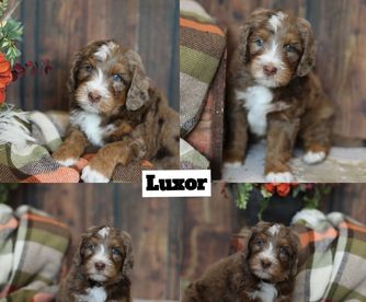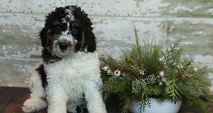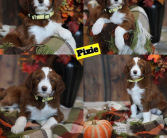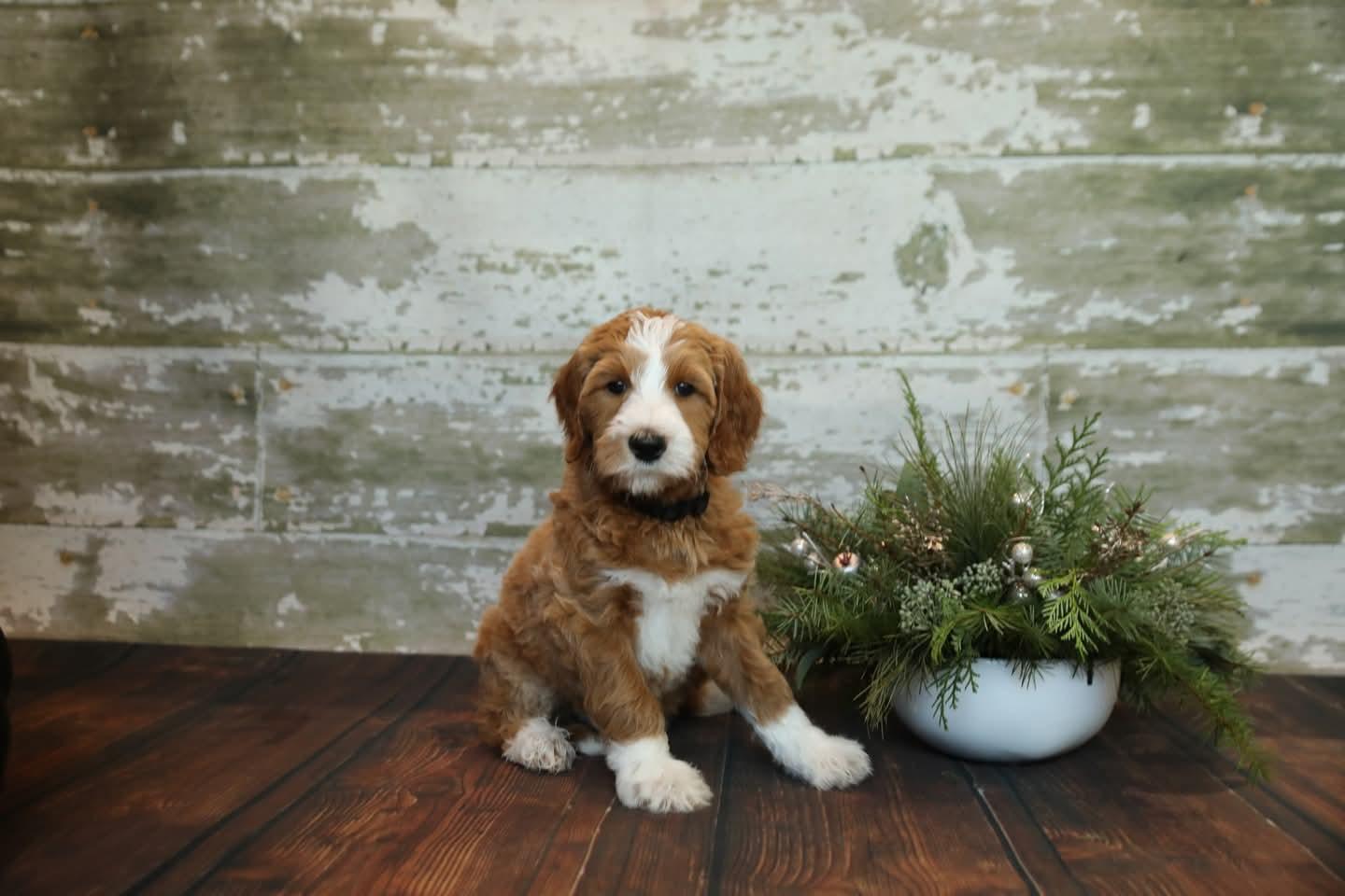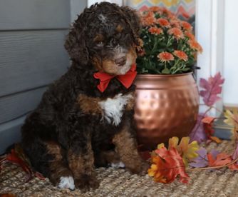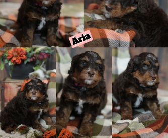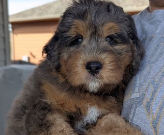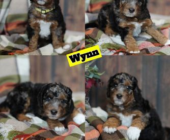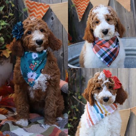 Our Bernedoodle puppies include brown, black, black and white, tri-color, and phantom. Goldendoodle puppies include red and parti. Colors will vary depending on the parent dogs.