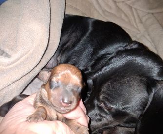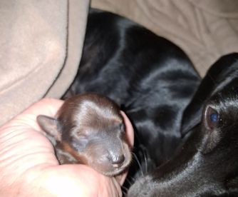 Chloe is a very calm and timid smaller smooth coat solid black. She is our calmest Dam. She loves to sleep under the warm covers with us. Prior to pregnancy she weighs 11 pounds.