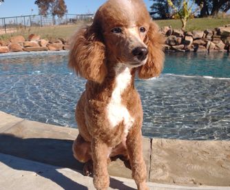 Monsieur Pierre is a sweet and regal AKC Mini Poodle. He is loved very much! What makes him gorgeous is his RUFUS gene which gives him his dark red coat, and the merle gene which gives him his one blue eye.