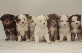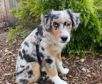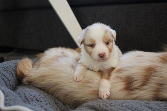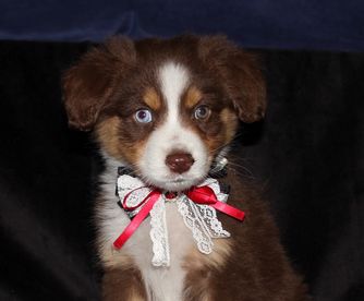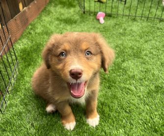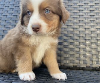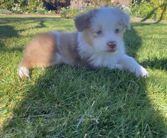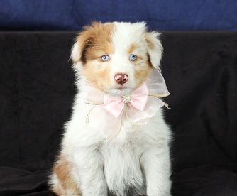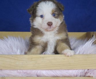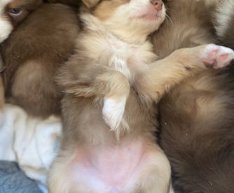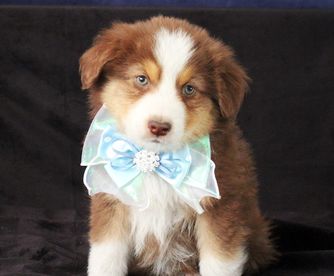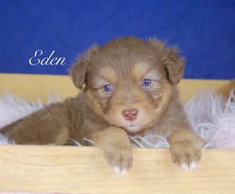 Our Golden Retriever puppies are light golden. Miniature American Shepherd puppies include blue merle and red. Colors will vary depending on the parent dogs.