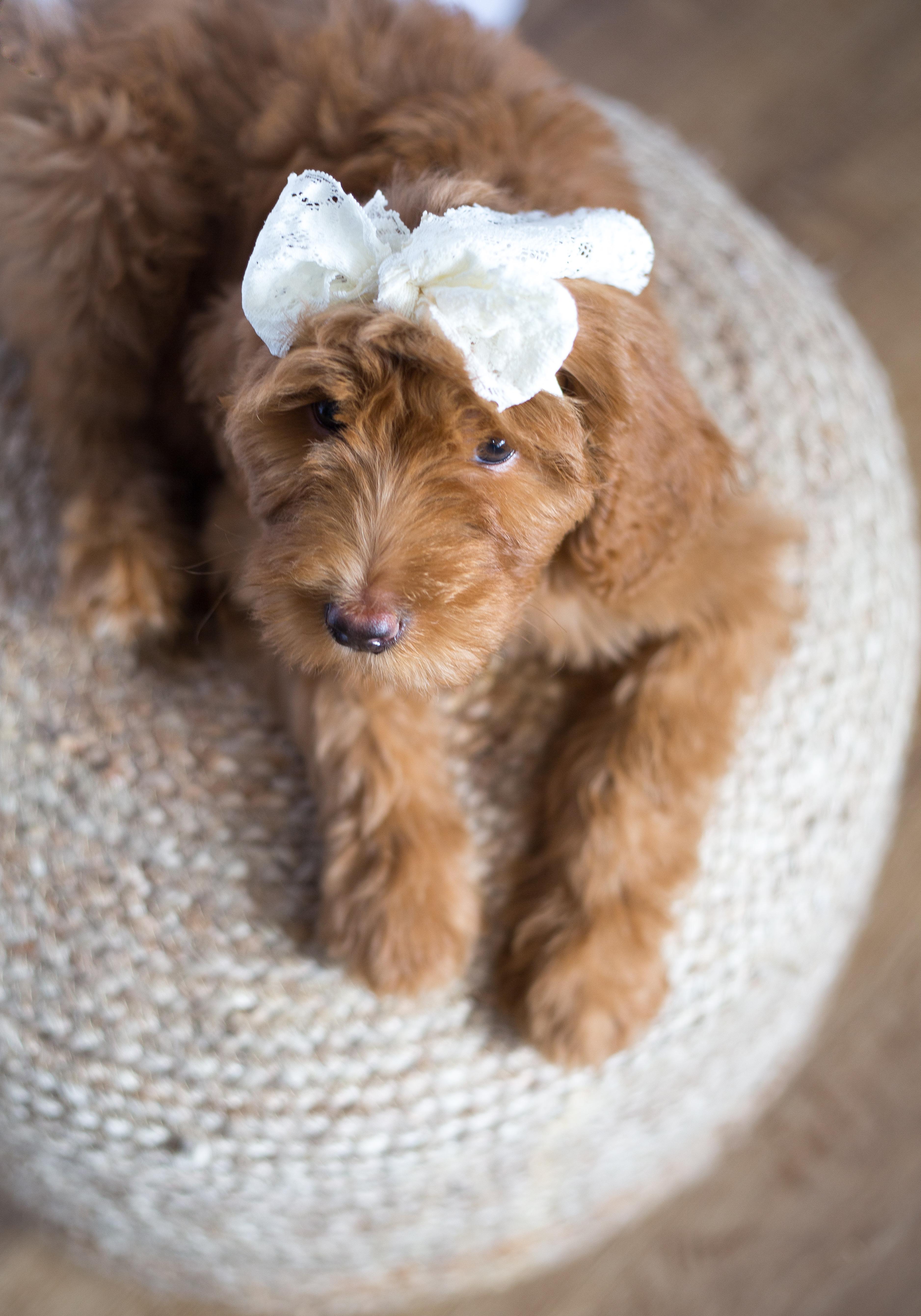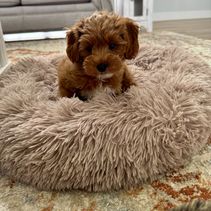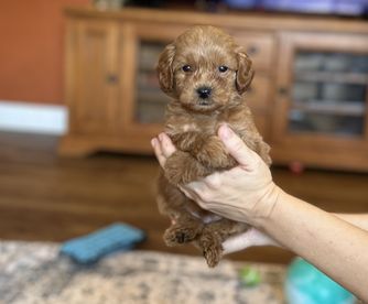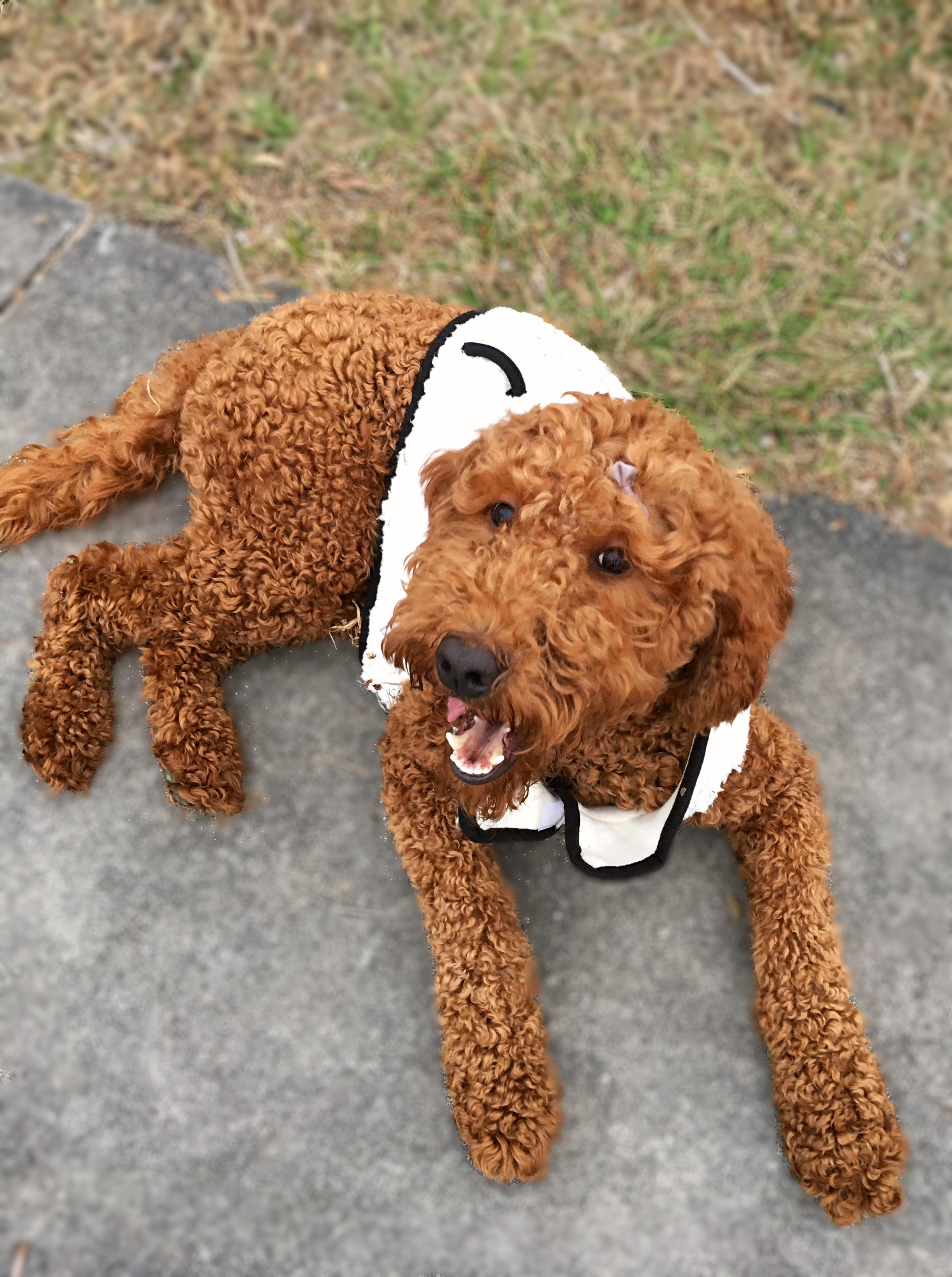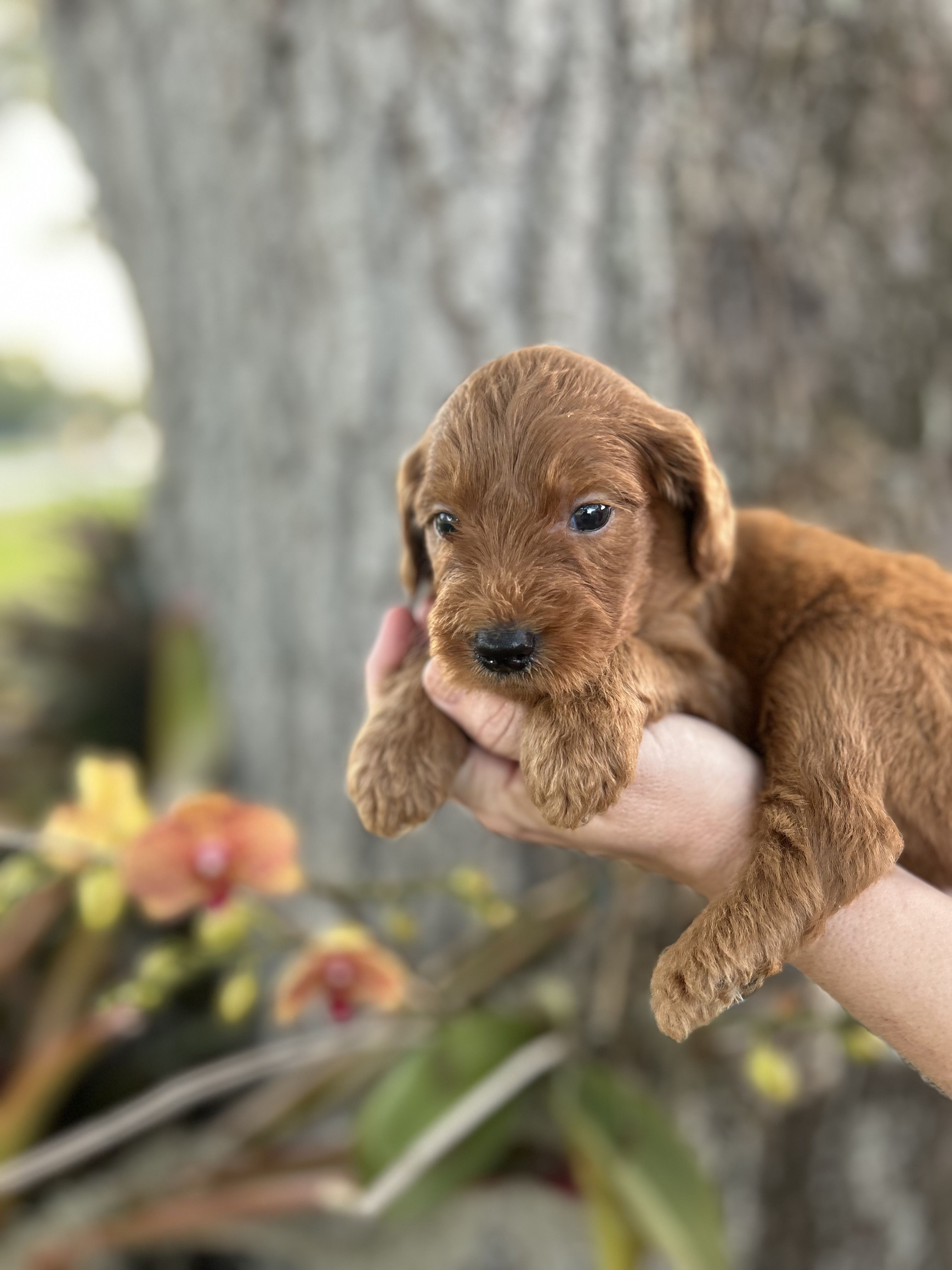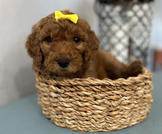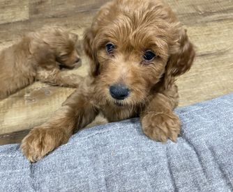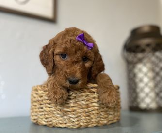 Lucy is the best! She is a 12lb Labradoole with a deep rich red coat that is nearly straight and a thick silky texture. her personality is just amazing! She is a funny girl, loves to cuddle, play, and just be with her humans. She is also super smart and has been an amazing mama to her babies/