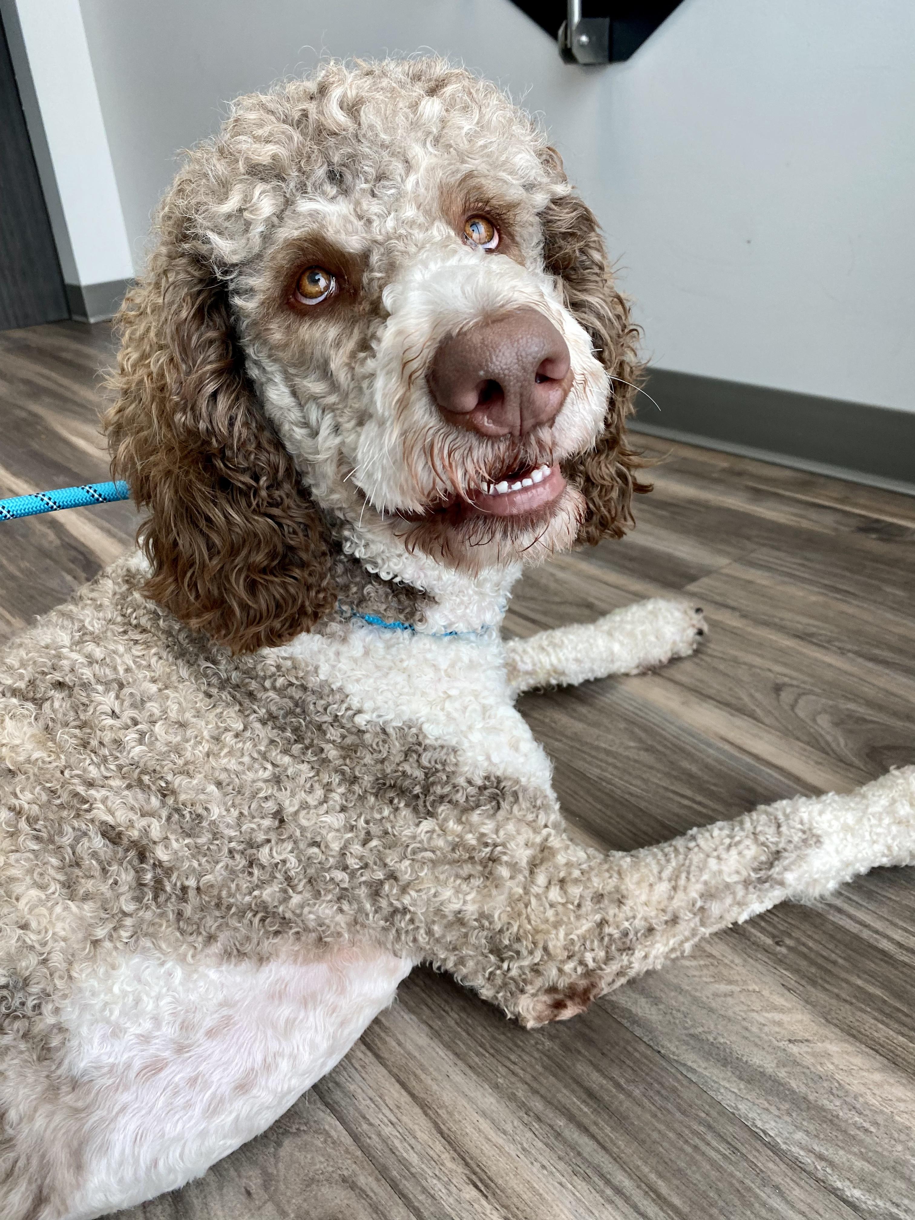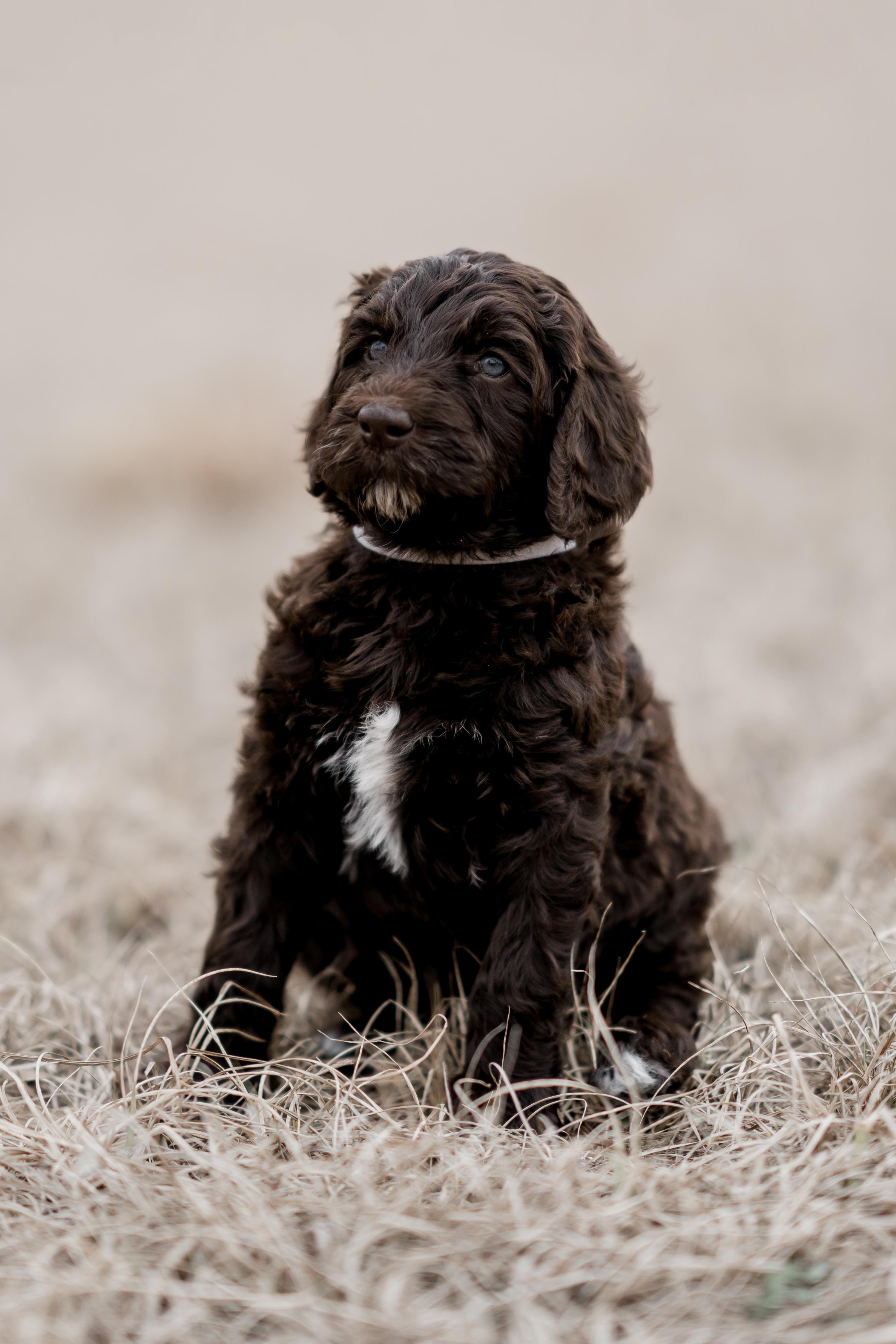 Duncan is a multi-generational labradoodle with liver points and green eyes. He has the softest curly hair to go along with his tuxedo coat. Duncan is a big teddy bear that loves the outdoors with our kids and animals. He also loves to snuggle in the evening while watching TV or a Movie. Duncan is non-shedding and hypoallergenic.