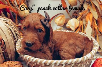 AVAILABLE: “Mayflower” Gray Collar Female is a 7 week old Red F1B Goldendoodle. She has a gorgeous red wavy coat and has the sweetest personality. Mayflower comes vet checked, first round of puppy shots, CKC Registration, & a puppy starter kit. Mayflower has been raised in a family environment and around children. Mayflower’s “Go Home Day” is Monday 11/24!