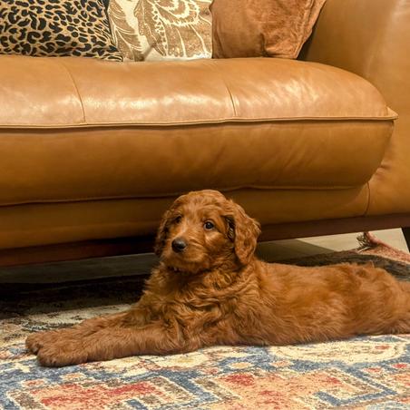 Our beloved dog, Esther, is quite the princess. She sleeps in our bed and is adored by the whole family. Esther is an F1 Standard Goldendoodle and has a very happy and loving personality, accompanied by a beautiful, red, wavy coat. She weighs about 65lbs but thinks she is a lap dog. Esther has remained a very healthy girl and routinely sees our amazing vet for her routine check-ups and vaccines. Esther is an excellent mother and adores her pups. She is very attentive and nurturing. We are so excited to offer Esther's finale litter of amazing F1B red standard goldendoodle pups so this is your last chance to score one of Esther and Charlie's incredible puppies.