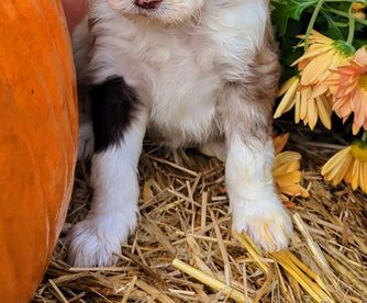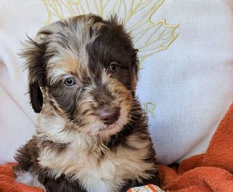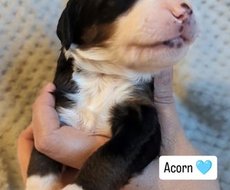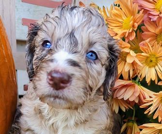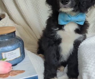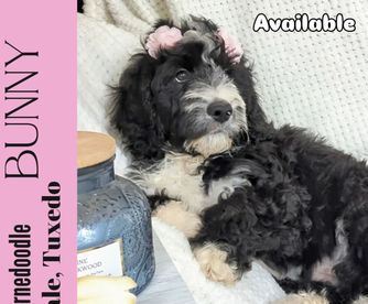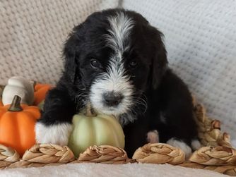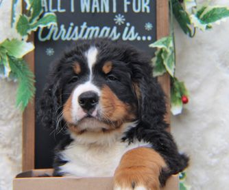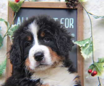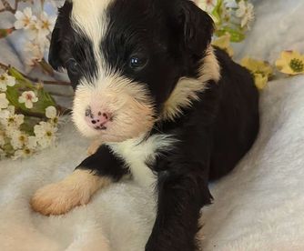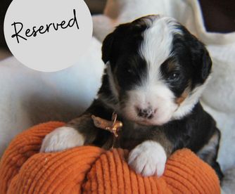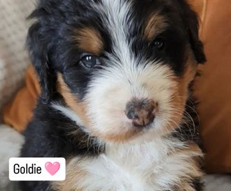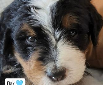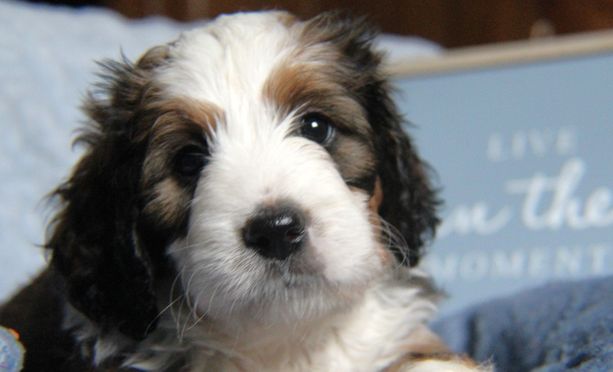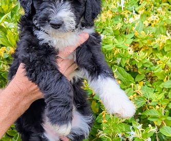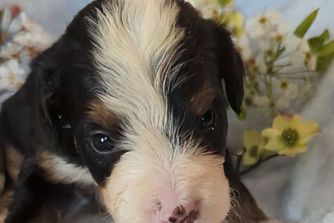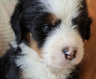 Our Bernedoodle puppies include black and white and tri-color. Bernese Mountain Dog puppies include tri-color and black and white. Aussiedoodle puppies include blue merle, red merle, black phantom, black and white, black tri-color, and red tri-color. Colors will vary depending on the parent dogs.
