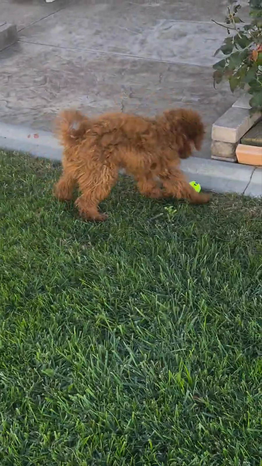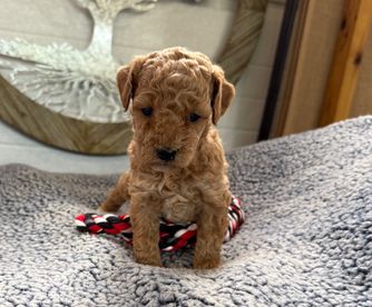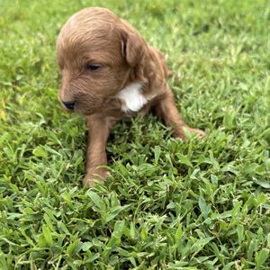 Muntee is a fun, silly, playful boy. He weighs only 8lbs and is our stud dog for creating our beautiful minis. He is a beautiful dark red in color with a white marking on his chest.