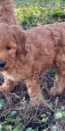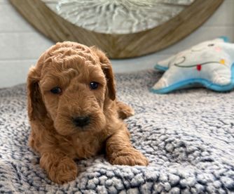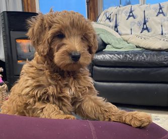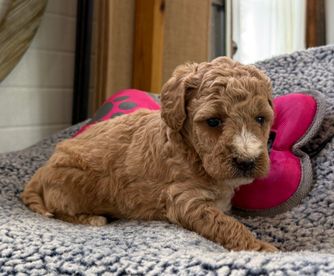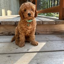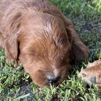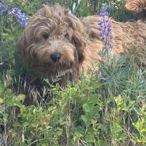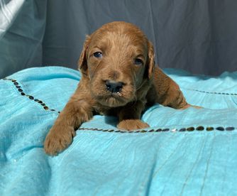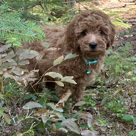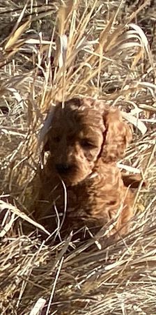 Mazie is a loving, playful and fully silly girl. She brings this amazing quality to her puppies as well. This girl also has a nose, she would have made an excellent hunting dog had she had the chance. Mazie is always happy and loves spending time with us. She is a beautiful dark red color with a wavy coat.