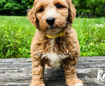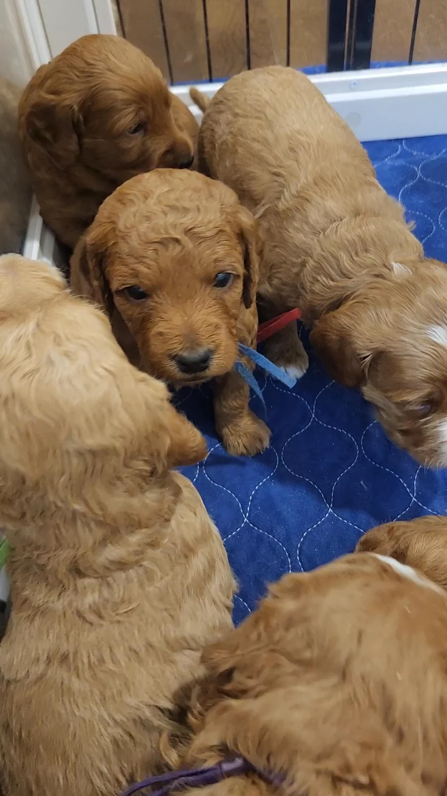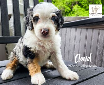 Our Goldendoodle puppies include cream, apricot, and red. Bernedoodle puppies include tri-color and merle. Colors will vary depending on the parent dogs.