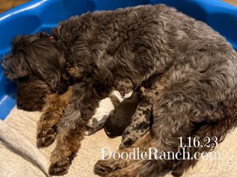 Our puppies are from 2 well-tested family Members. We use sires that are family dogs like ours. Ours is a family affair; we want all our breeding Doodles to be family members first, breeding dogs second. We are committed to every puppy born in our home and take excellent care of the newest members of our family from their first day.