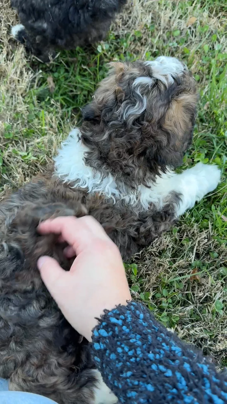 Our Sheepadoodle puppies include grizzle and white, gray and white, blue merle and white, blue gray and white, and black and white. Poodle puppies include brown, parti, and phantom. Double Doodle puppies include black, brown, and brindle. Colors will vary depending on the parent dogs.