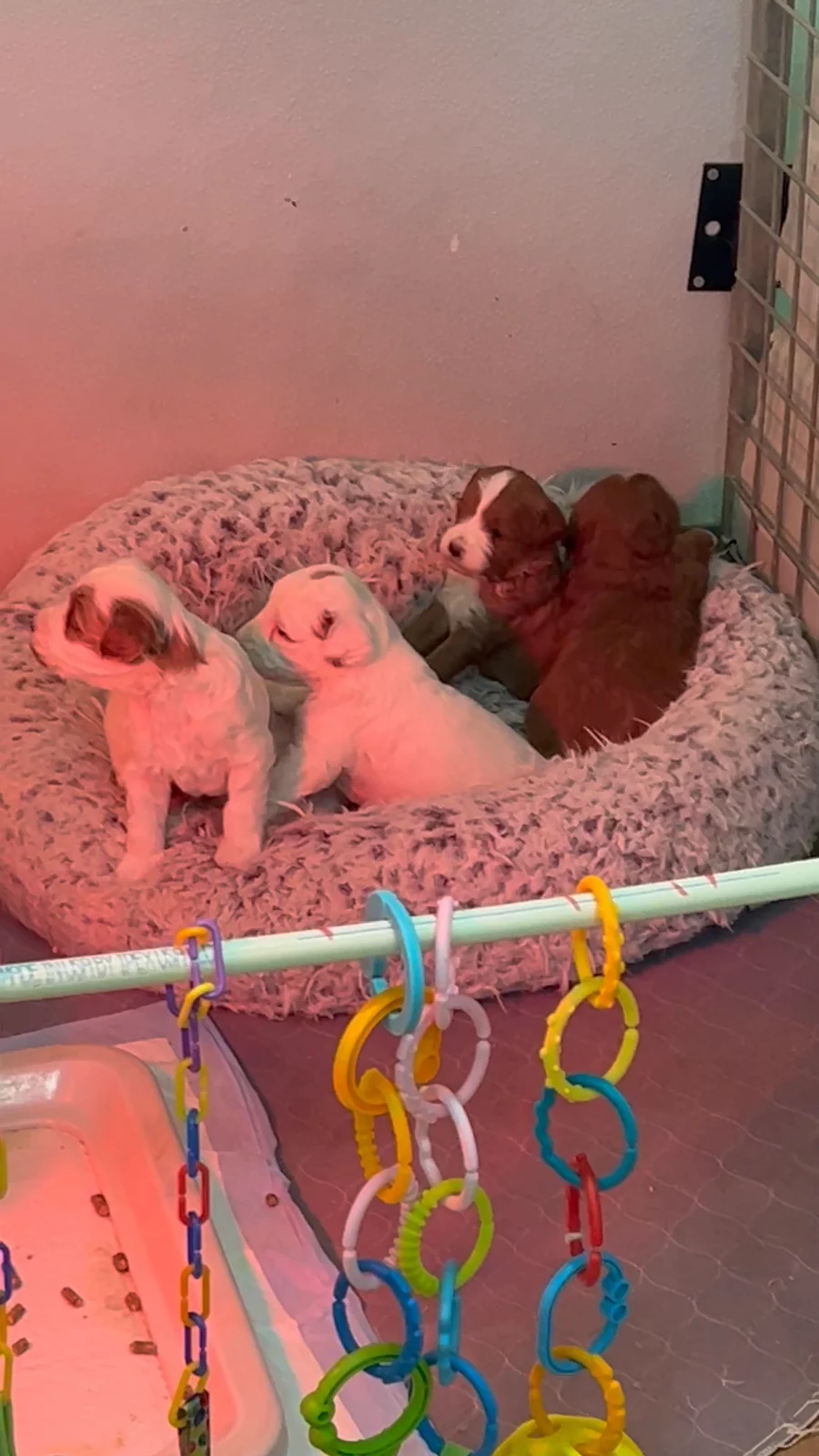 Petite Goldendoodles are doing so good. They have begun eating solid food. They are playing more and beginning to use their potty tray.