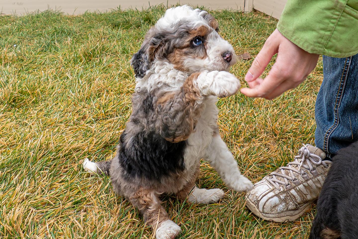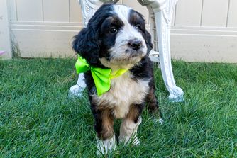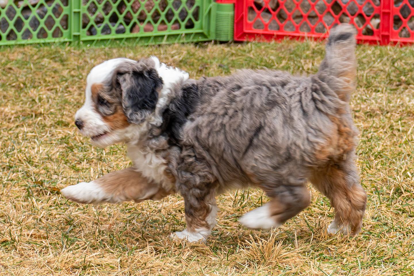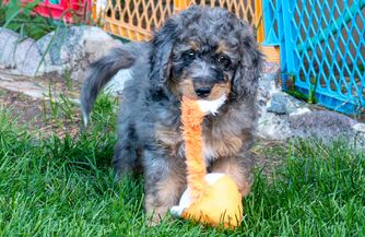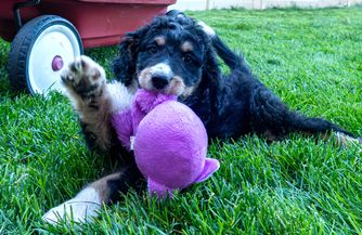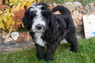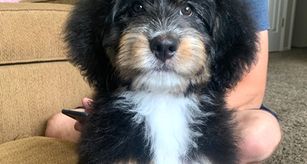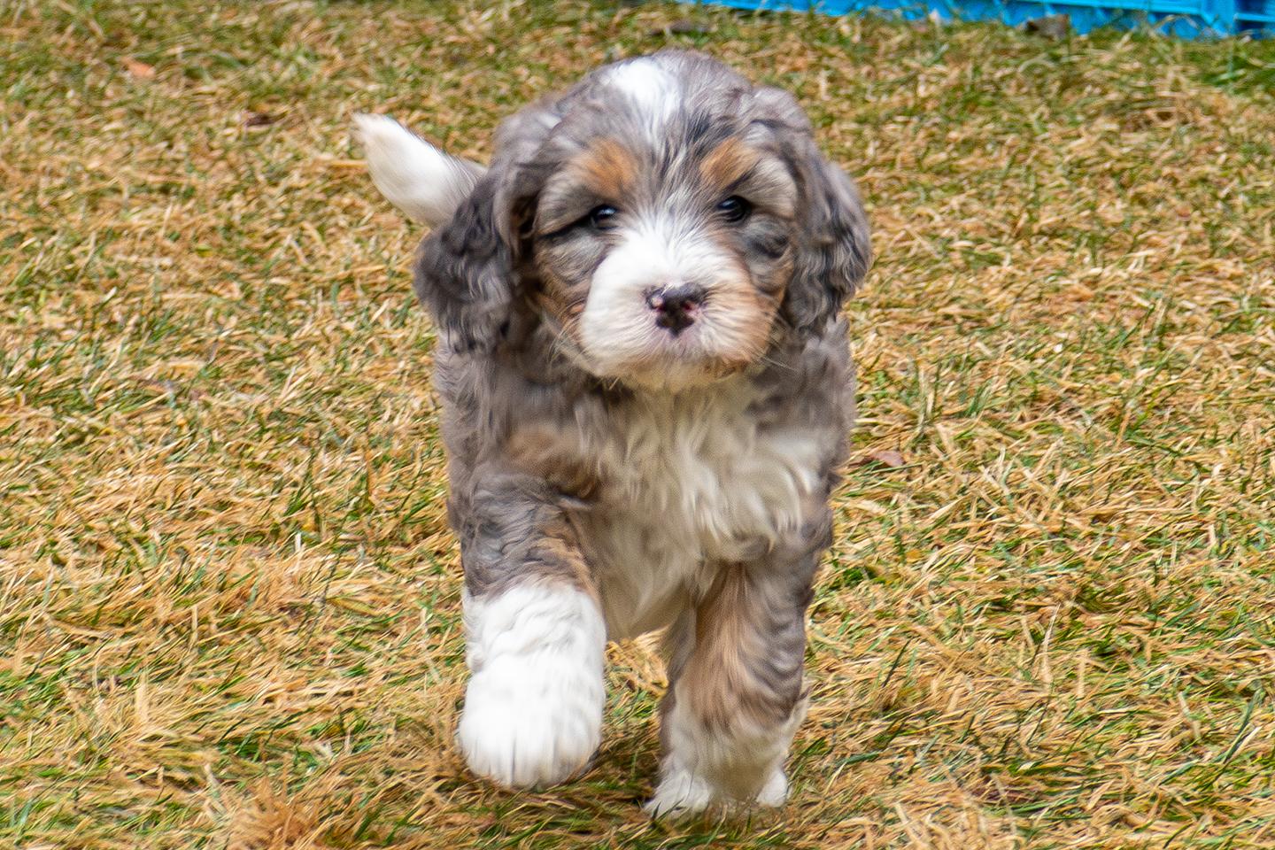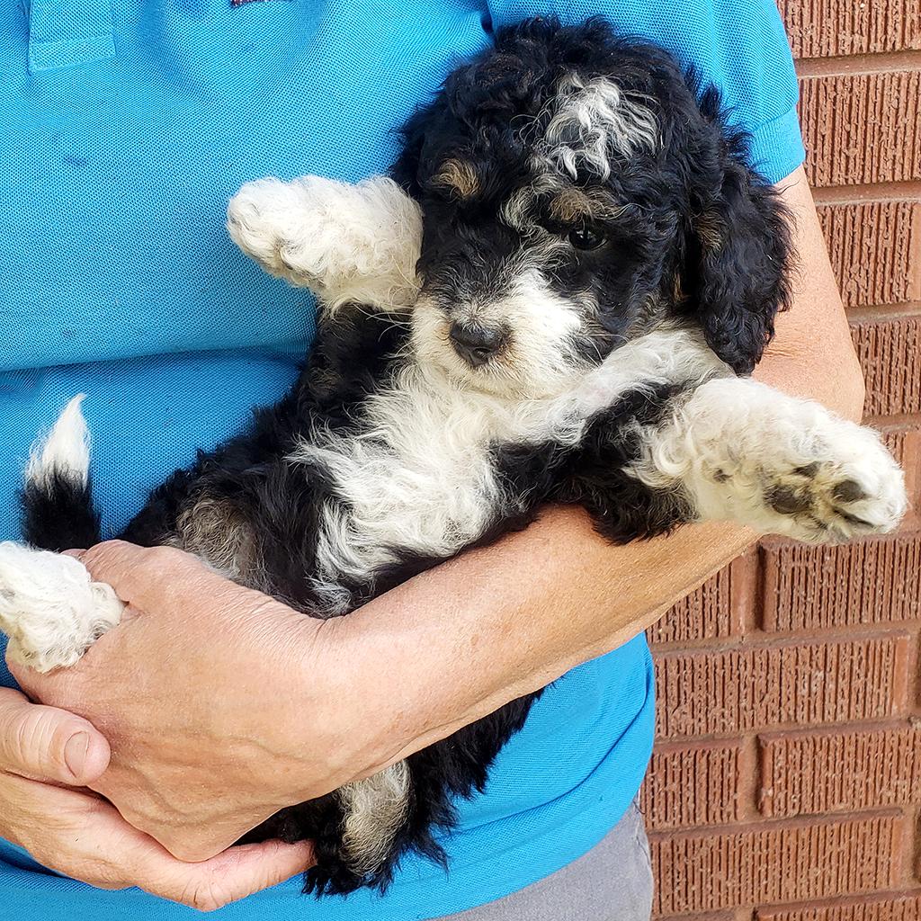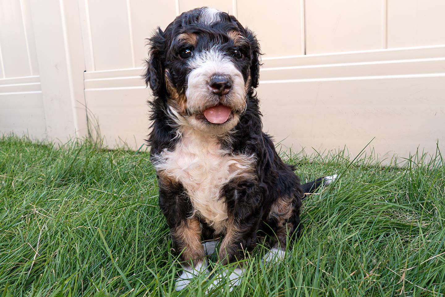 Our Goldendoodle puppies include cream, apricot, red, black, merle, and parti. Bernedoodle puppies include sable, black and white, tri-color, phantom, and merle. Colors will vary depending on the parent dogs.