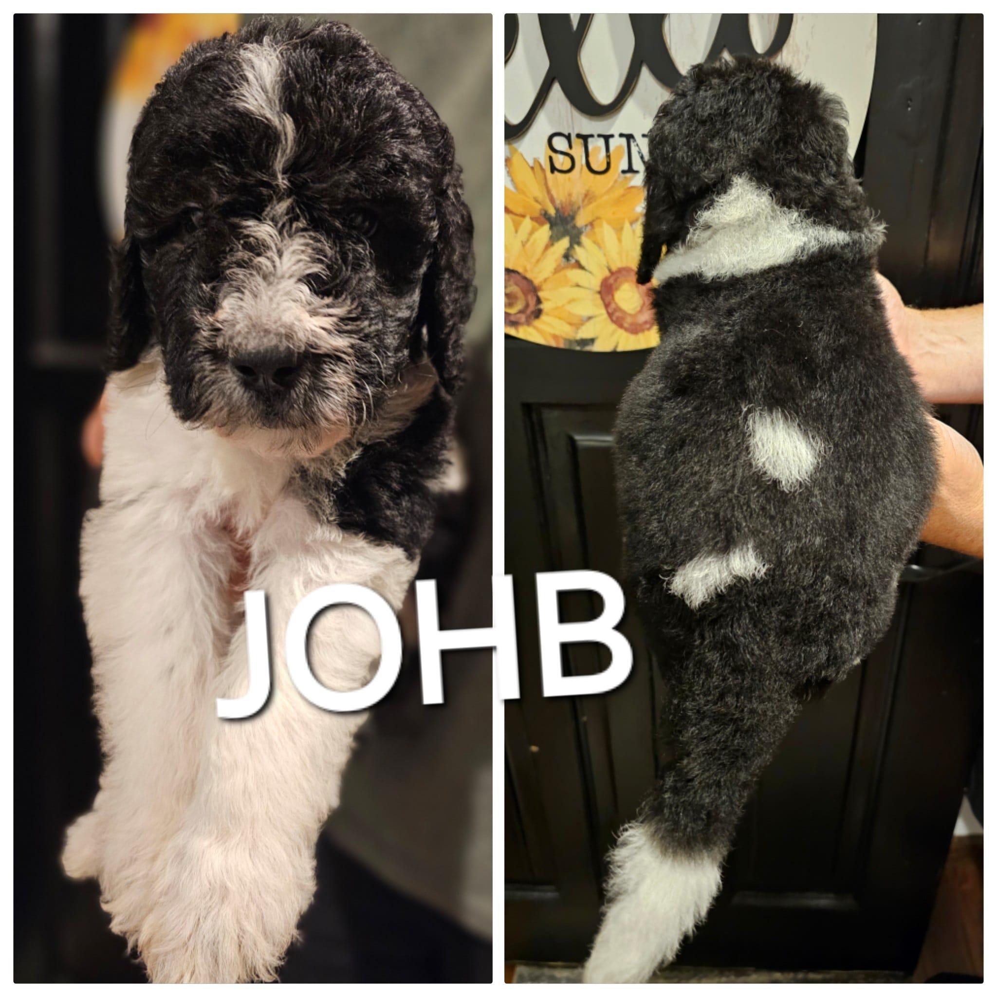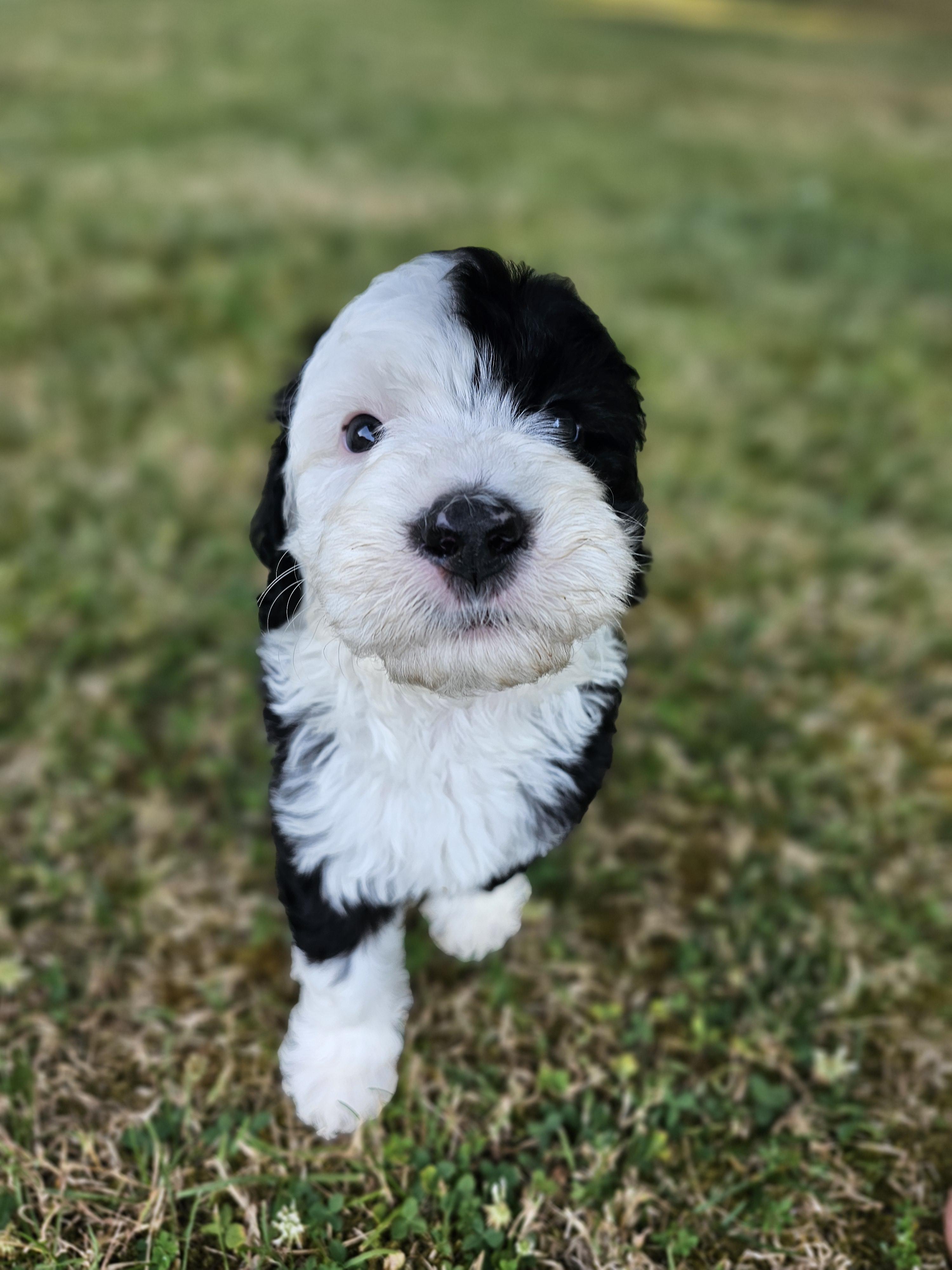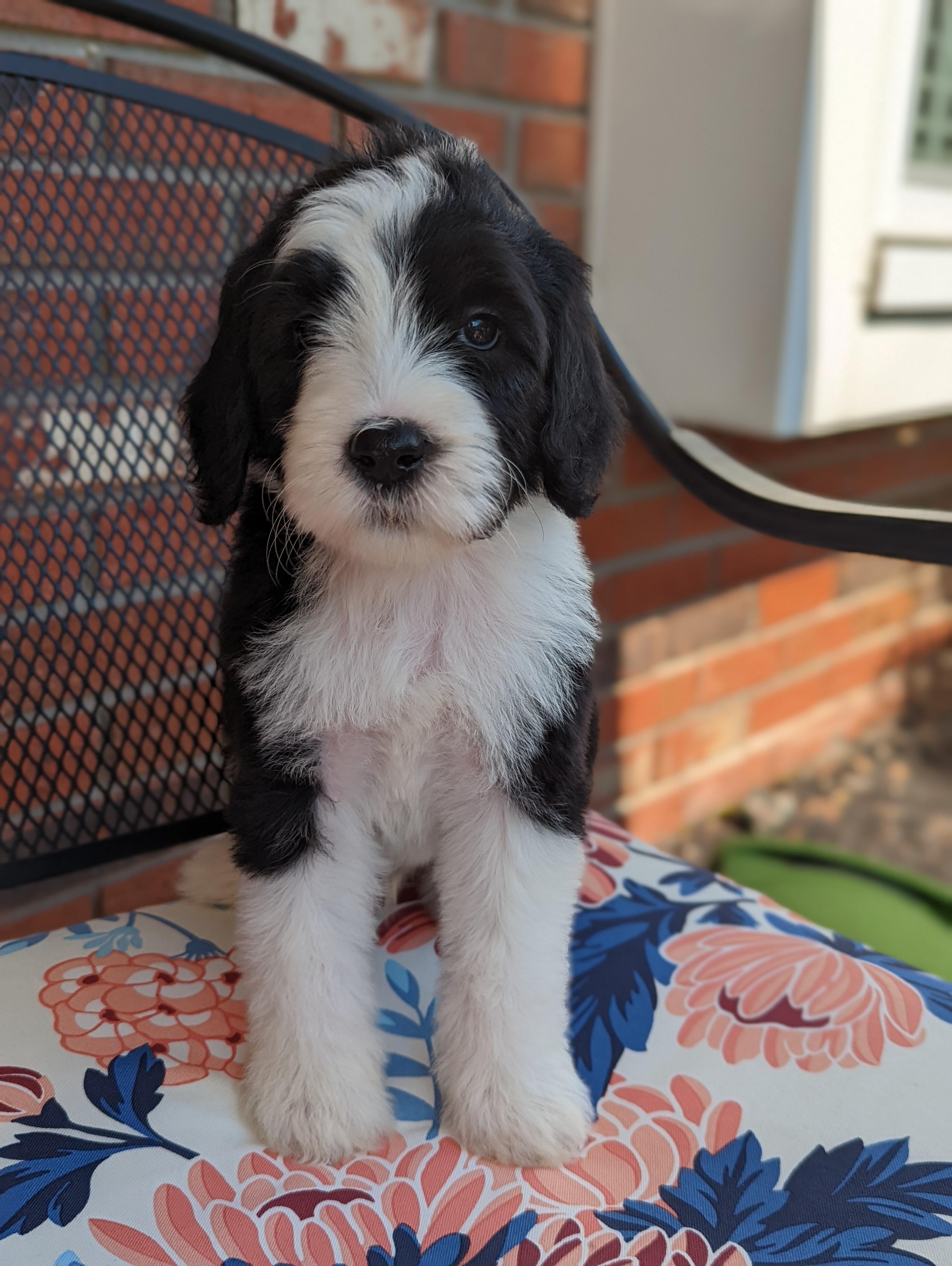 Our Sheepadoodle puppies are black and white. Saint Berdoodle puppies are brown and white. Colors will vary depending on the parent dogs.