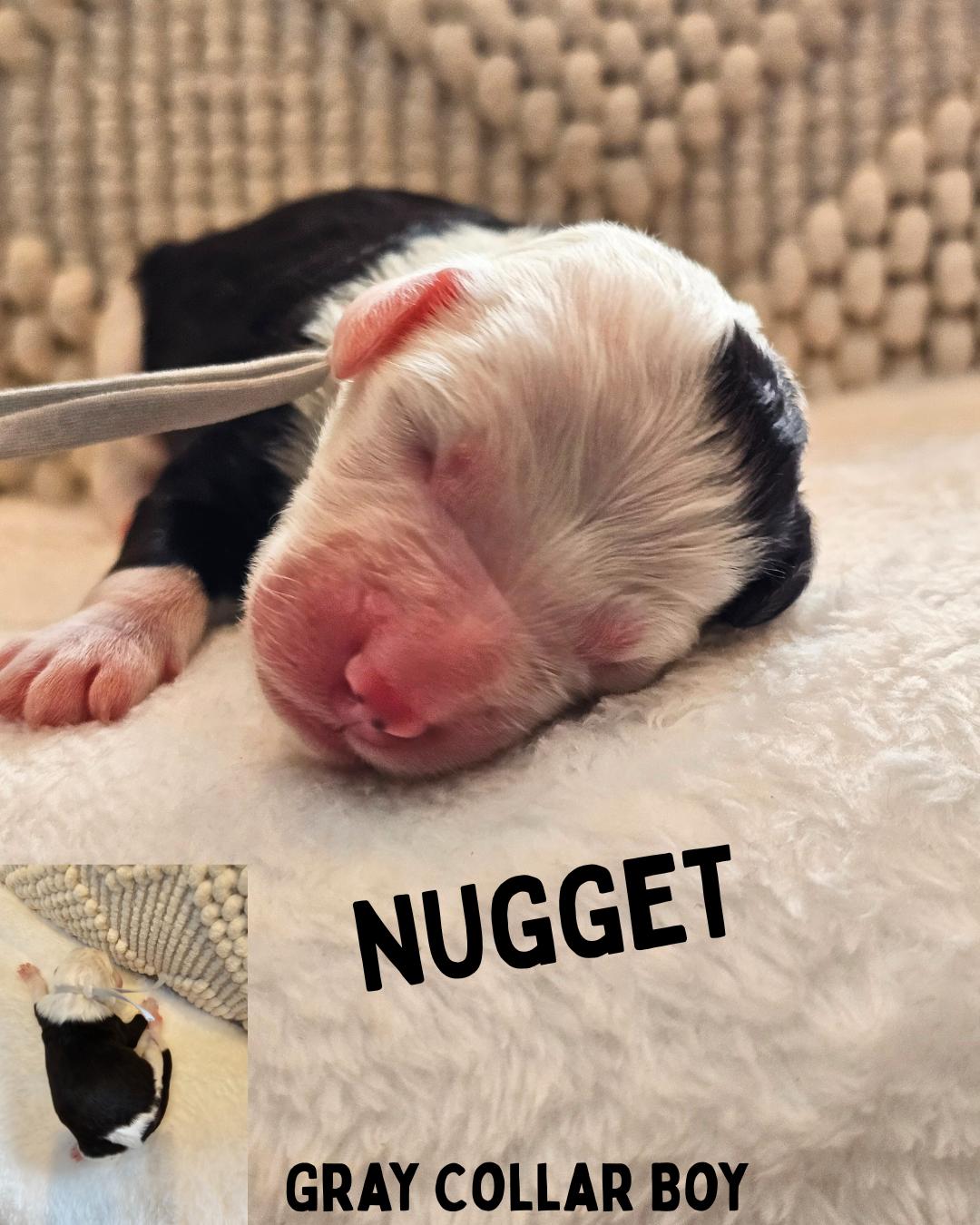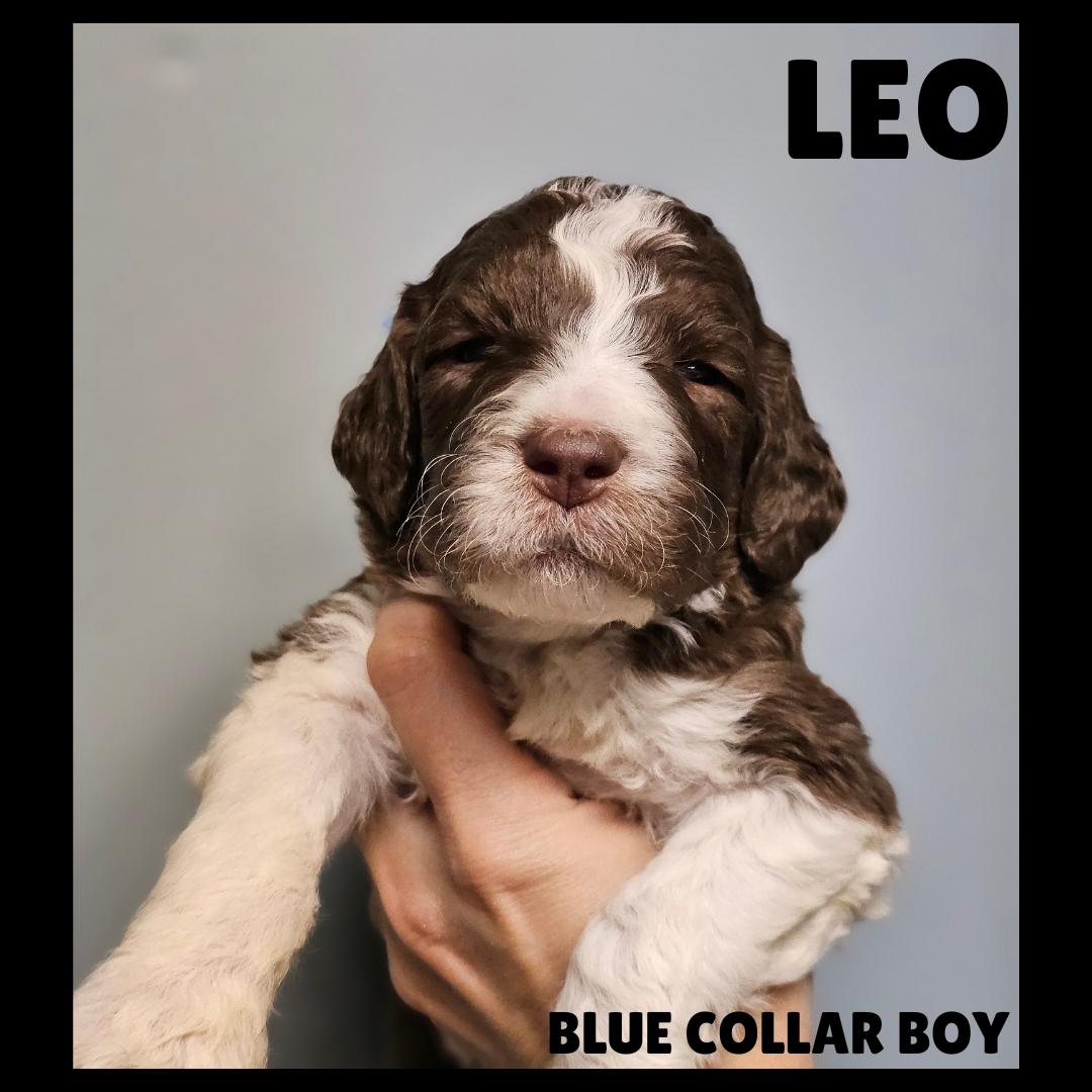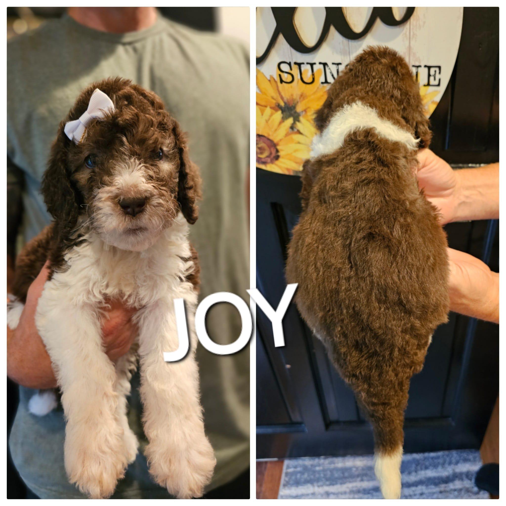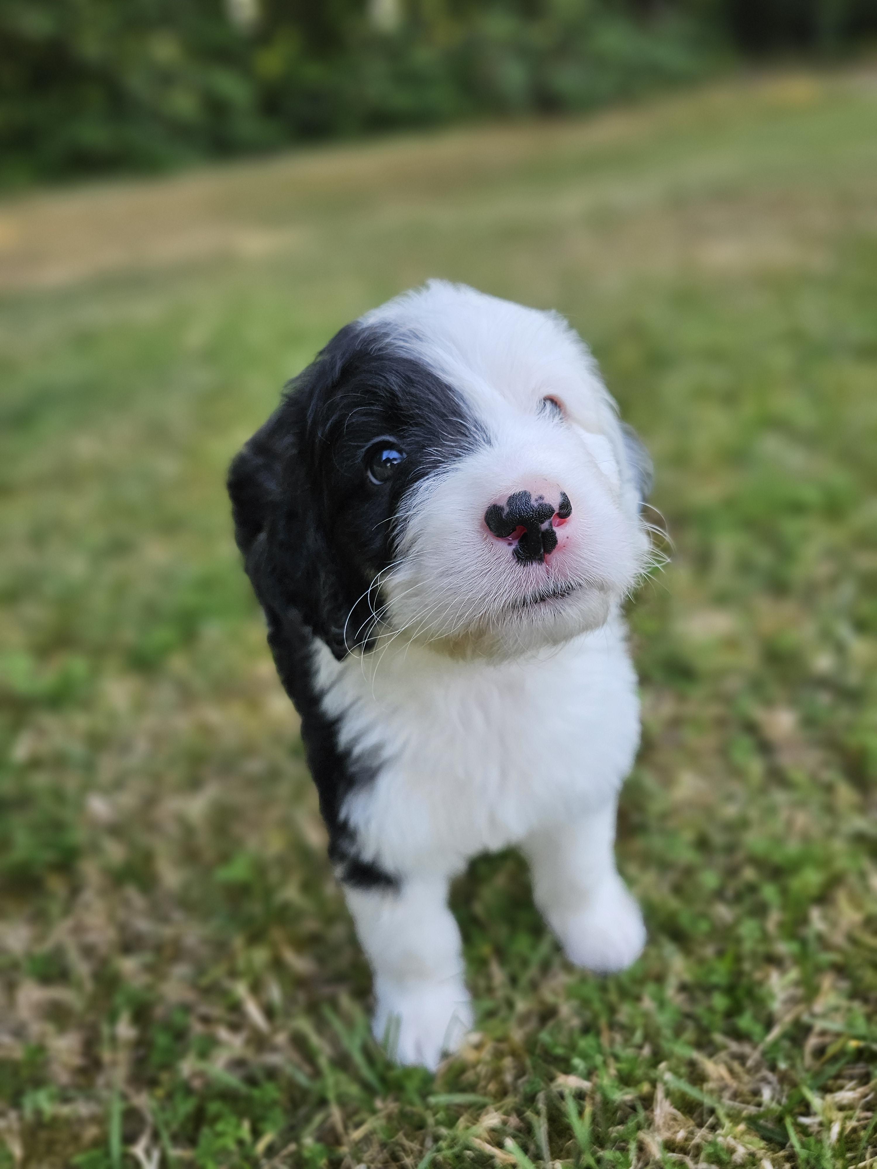 Our Sheepadoodle puppies are black and white. Saint Berdoodle puppies are brown and white. Colors will vary depending on the parent dogs.