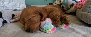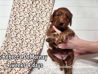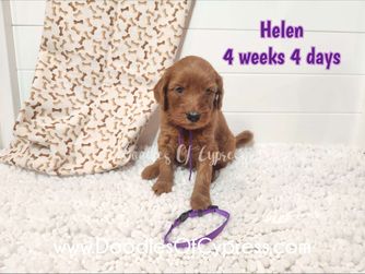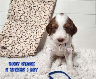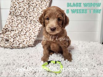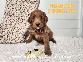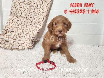 Reba was produced here at Doodles Of Cypress and is the daughter of our retired Josie (Josephine Pearl) and Mustang's Gunslinger (an AKC toy poodle). She is extremely human focused and wants nothing more than to cuddle. She enjoys playing with her mom and the other dogs in our pack, and can still very much be a puppy at heart still.