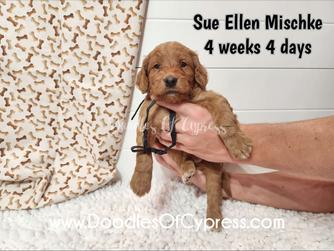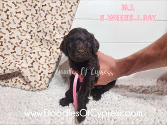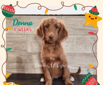 Her hair is EXTREMELY curly -- so much so that she appears to be a full-blooded poodle. When bred with Tucker, our loose-wavy, flatter coated Stud, they produce beautiful wavy/curly babies that are EXTREMELY low-shed (perceived as no-shed) .