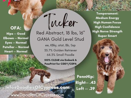 Tucker was produced by Donna's Doodlebugs and is the son of Evie Patootie (a 12 lb F1 Goldendoodle -- yes, she is a 12 lb F1) and a 25 lb Multi-Gen, Sir Linus. He is extremely human focused and wants nothing more than to cuddle and be with his people. He enjoys playing with his fur brothers and sisters in our pack, and can still very much be a puppy at heart. Tucker is a multi-gen and has 35.7% Golden Retriever via Embark.