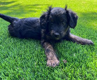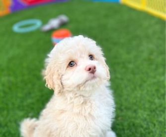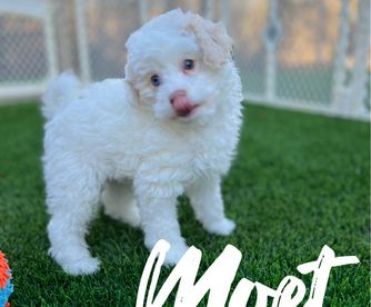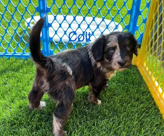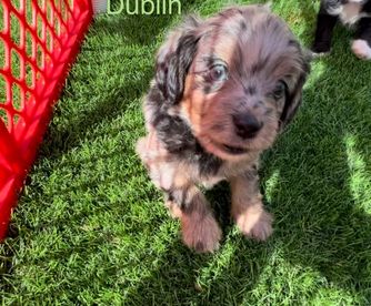 Our Aussiedoodle puppies include blue merle and black phantom. Goldendoodle puppies include cream, apricot, merle, and parti. Colors will vary depending on the parent dogs.