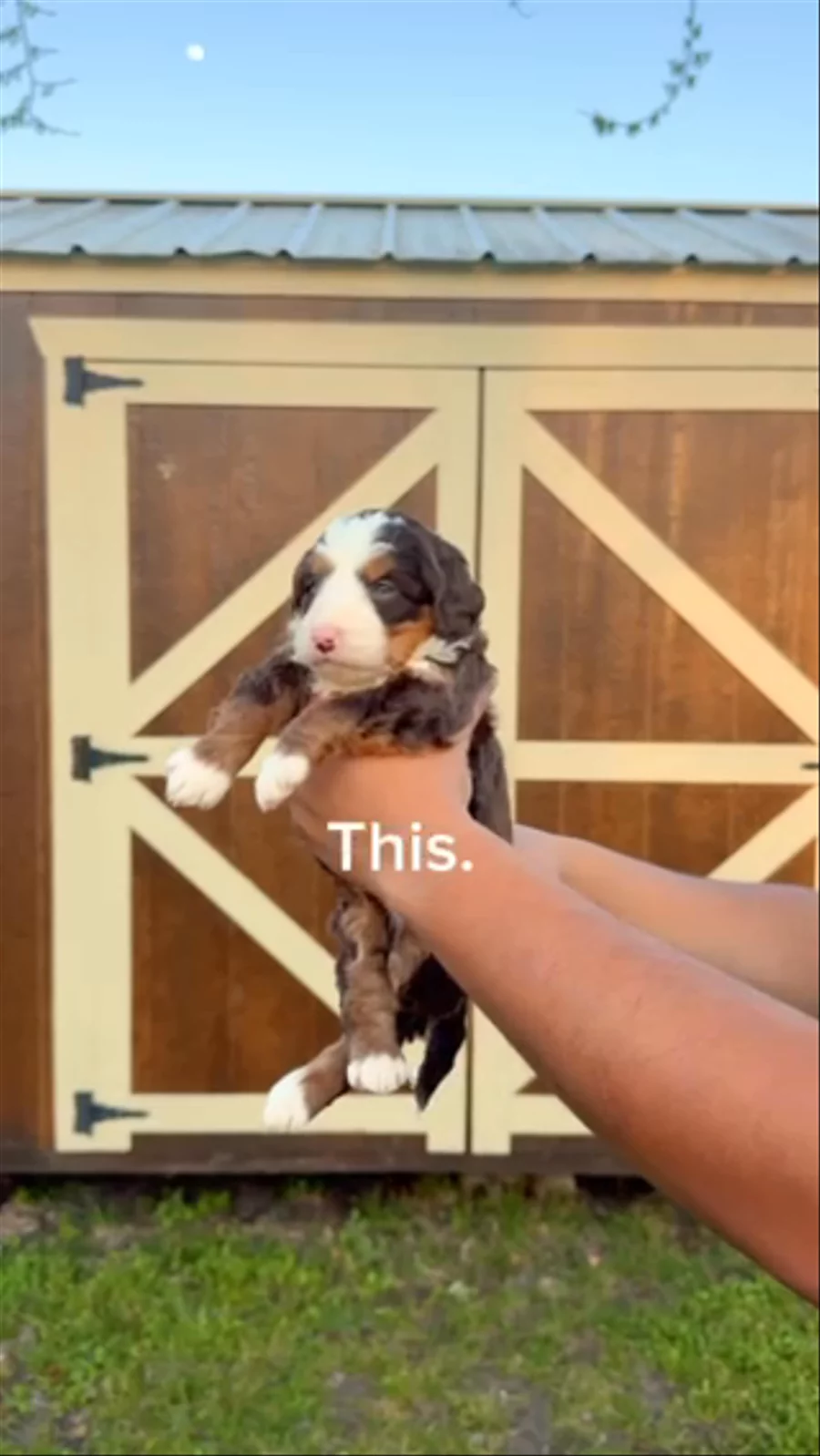 Bernie is a little bundle of love with a big personality! As an F2 Micro Mini Bernedoodle, she’s the perfect mix of playful energy and gentle affection. Always ready for an adventure, Bernie’s zest for life shines whether she’s zooming around the yard, greeting you with happy tail wags, or snuggling up for some well-earned cuddle time. Her intelligent and loving nature makes her a joy to be around, and her soft, wavy coat adds to her irresistible charm. With a heart as big as her spirit, Bernie brings endless joy to everyone she meets!