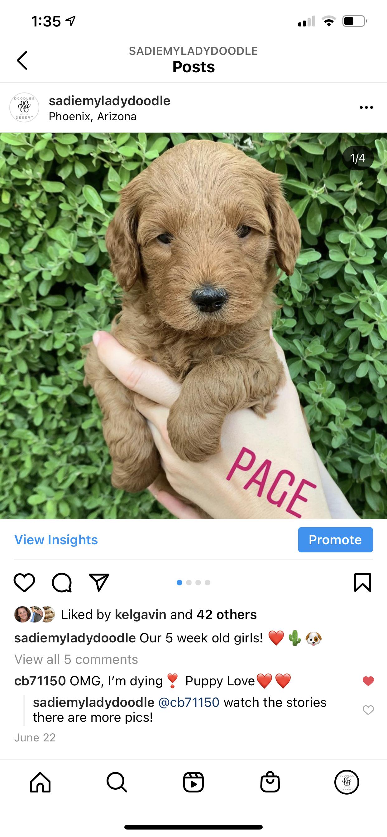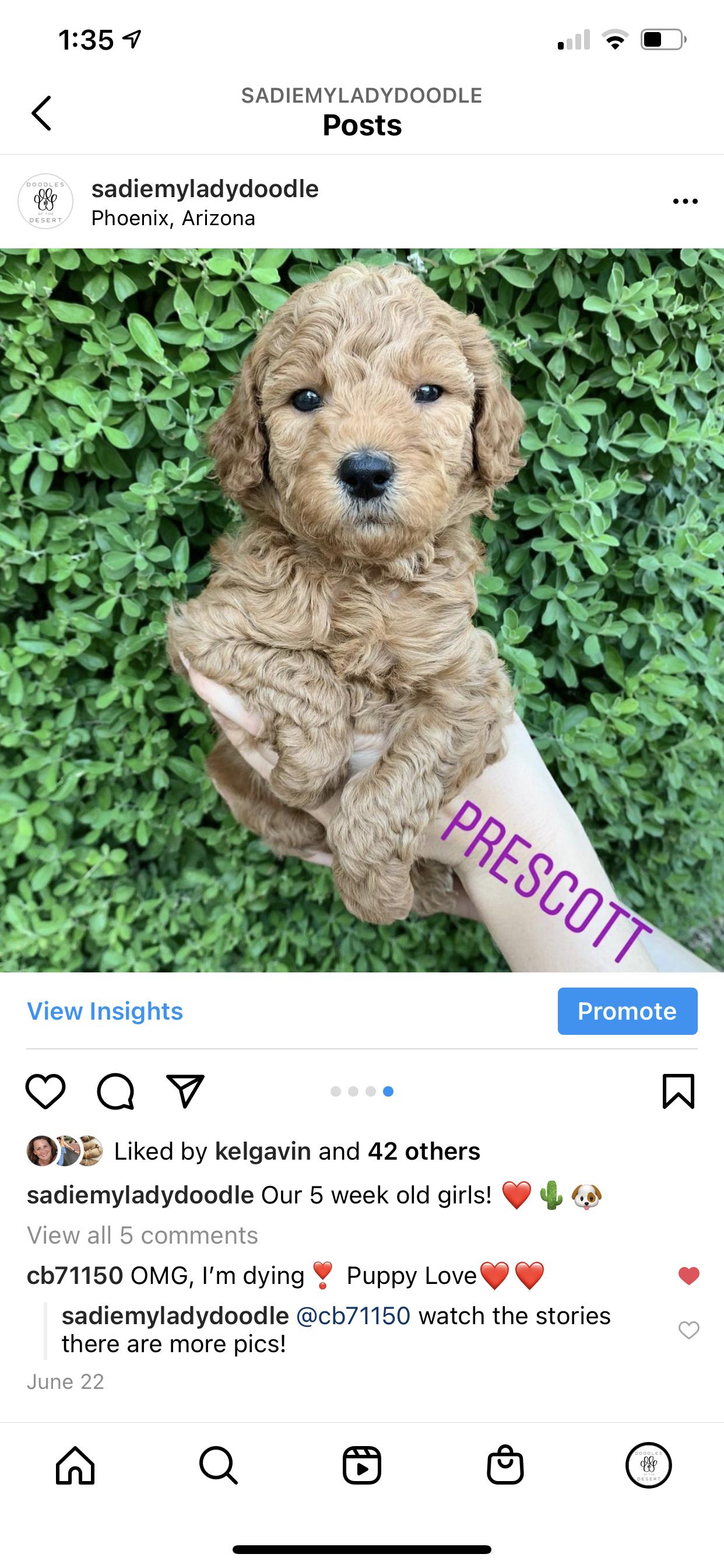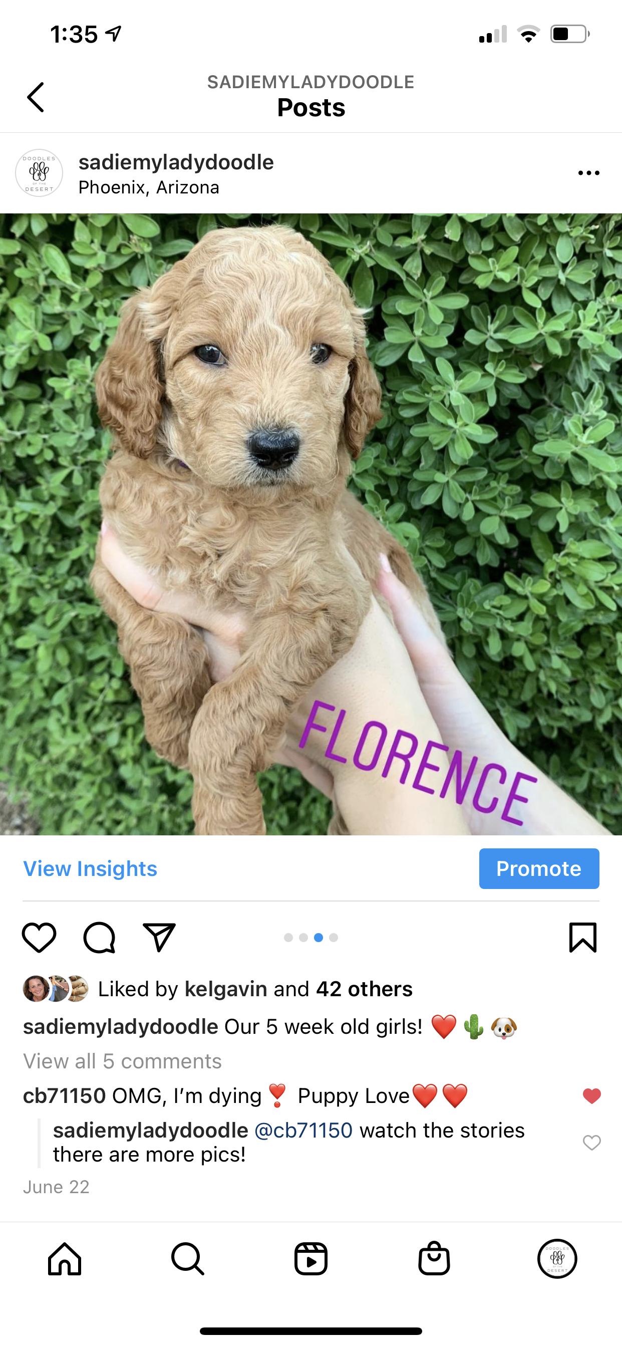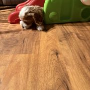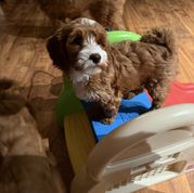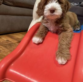 I had a mini golden doodle in the past and wanted another one. I reached out to Sarah, who from the outset, was very knowledgeable and helpful- even though I was still looking and hadn’t made up my mind to get my pup from her. Her selfless help and honesty impressed me so much that I decided to get my new friend from her. Once I put the deposit in, she was thoughtful enough to FaceTime the puppies with me so I could decide which one would be best for me. At last, I went to pick up my little friend. She is already potty trained!! Sarah’s guidance about the first few weeks made sense, and applying those pearls of wisdom have begun to show positive results already. She continues to be accessible for any questions and concerns. I cannot say enough how much I have learned from her and how grateful I am that she was the breeder of my little Carmen!!