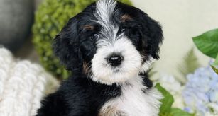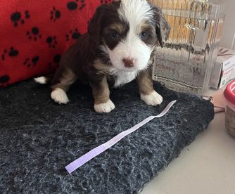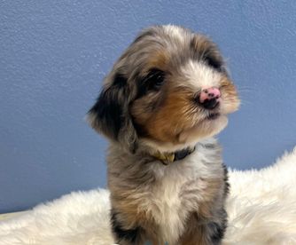 Tri color mini bernedoodle Tootsie ha soft curls, thick coat and long legs. She is very slender and moderate energy. She is easy to discipline.