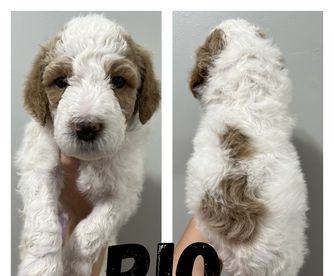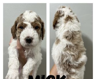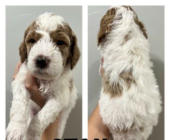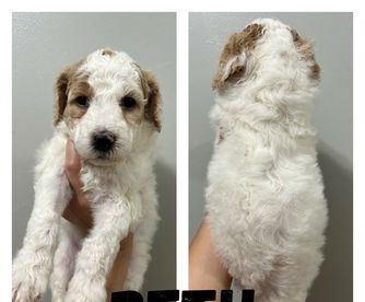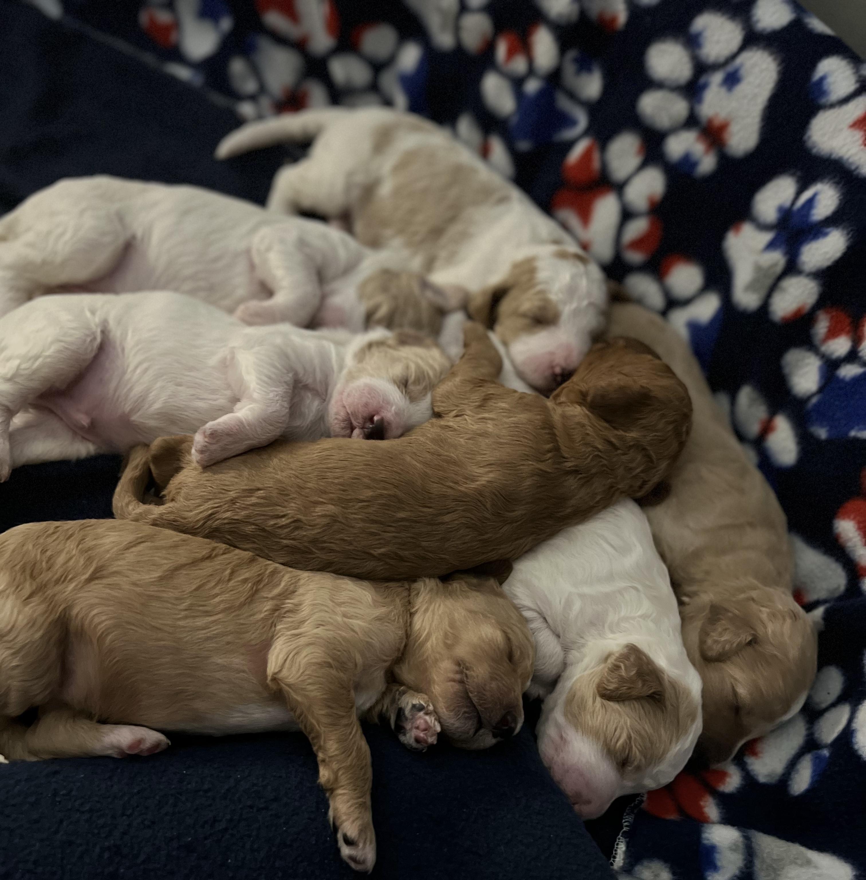 Our Poodle puppies are parti. Goldendoodle puppies include cream, apricot, red, and parti. Colors will vary depending on the parent dogs.